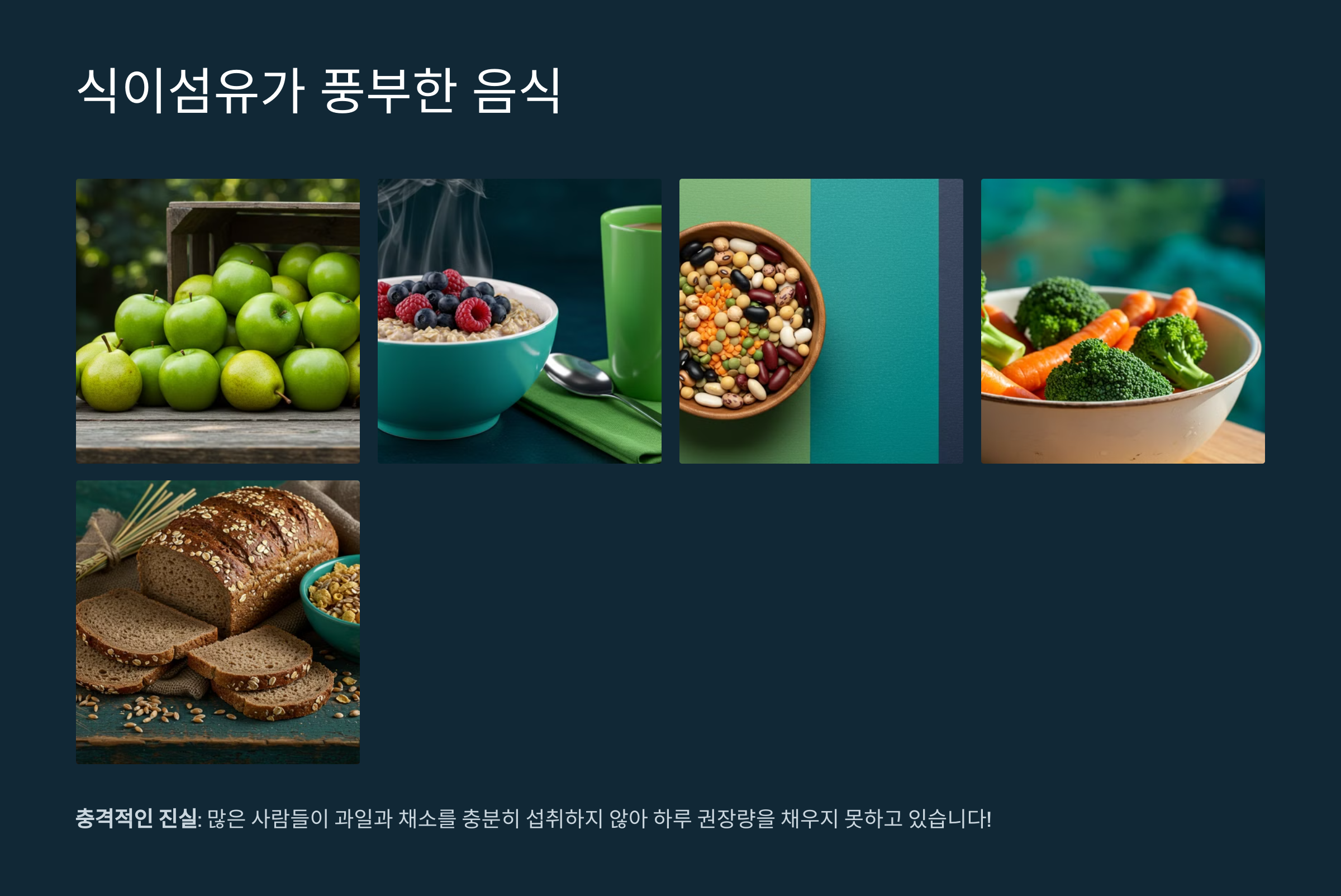 식이섬유는 과일, 채소, 통곡물, 콩류 등에 풍부하게 들어 있습니다. 예를 들어, 사과, 배, 당근, 브로콜리, 귀리, 보리 등이 대표적인 식이섬유 공급원입니다. 충격적인 진실: 많은 사람들이 과일과 채소를 충분히 섭취하지 않아 하루 권장량을 채우지 못하고 있다는 사실!