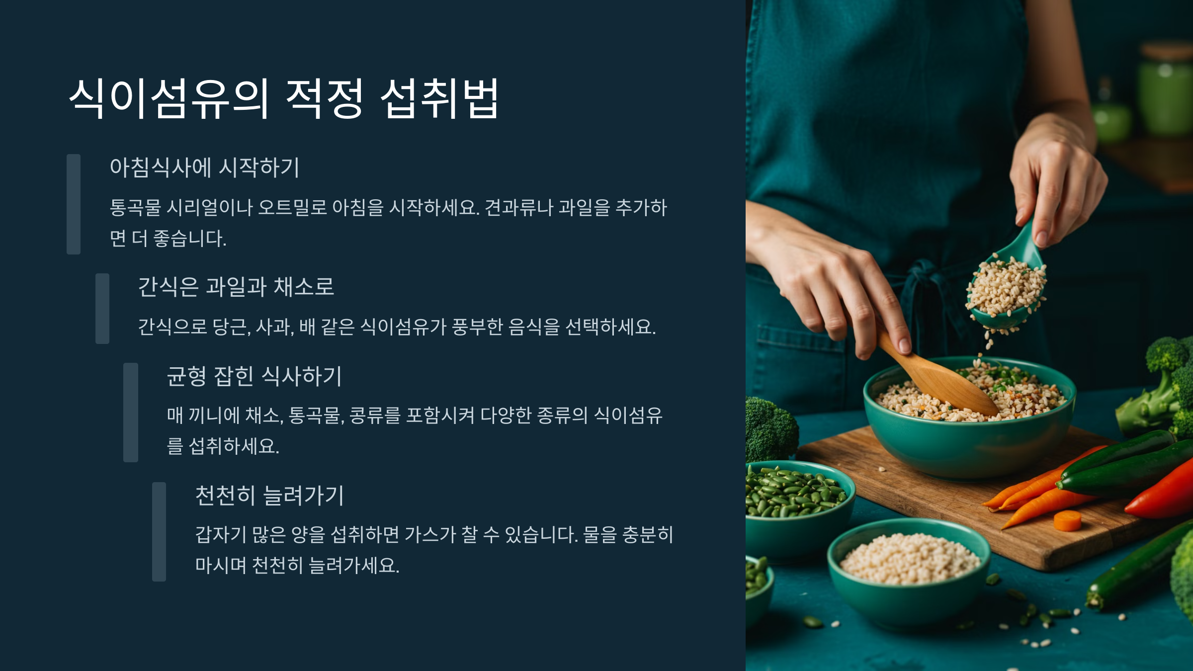식이섬유는 한 가지 음식에만 의존하지 않고, 다양한 음식을 섭취하는 것이 중요합니다. 예를 들어, 아침에 오트밀을 먹고 점심에는 샐러드를 먹으며, 저녁에는 통곡물로 만든 음식을 섭취하는 방식입니다. 이를 통해 다양한 식이섬유를 섭취할 수 있습니
