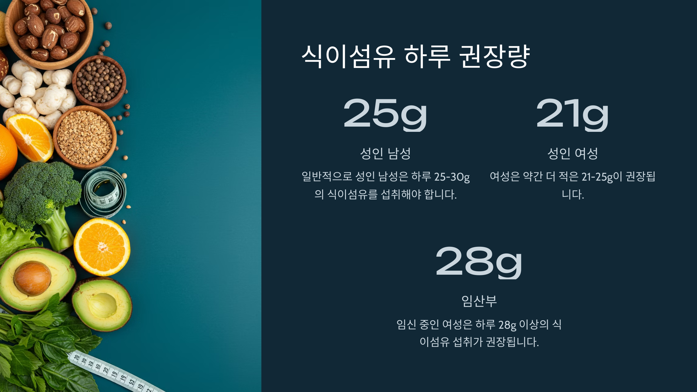 일반적으로 성인 남성은 하루 2530g의 식이섬유를 섭취하는 것이 좋다고 알려져 있습니다. 여성은 약간 더 적은 2125g이 권장됩니다. 하지만 이 양은 식이섬유가 풍부한 음식을 꾸준히 섭취했을 때를 기준으로 한 권장량입니다. 놀라운 사실이: 많은 사람들이 이 권장량을 채우지 못하고 있다는 점!
