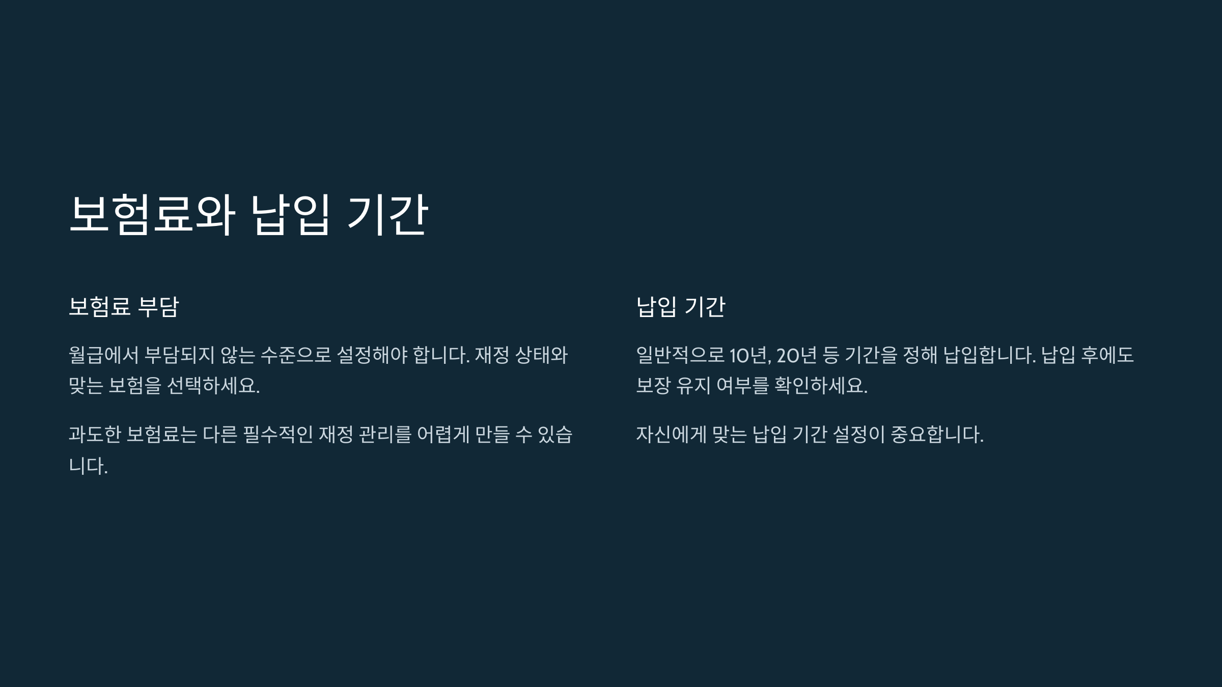 보험료는 자신이 감당할 수 있는 범위 내에서 설정해야 합니다. 보험료가 과도하게 부담스러우면 다른 필수적인 재정 관리를 어렵게 할 수 있습니다. 또한 보험료 납입 기간도 중요한 요소입니다. 납입 기간이 지나면 보험료를 더 이상 내지 않지만, 보장 내용은 계속 유지되므로 이 부분도 잘 고려해야 합니다.