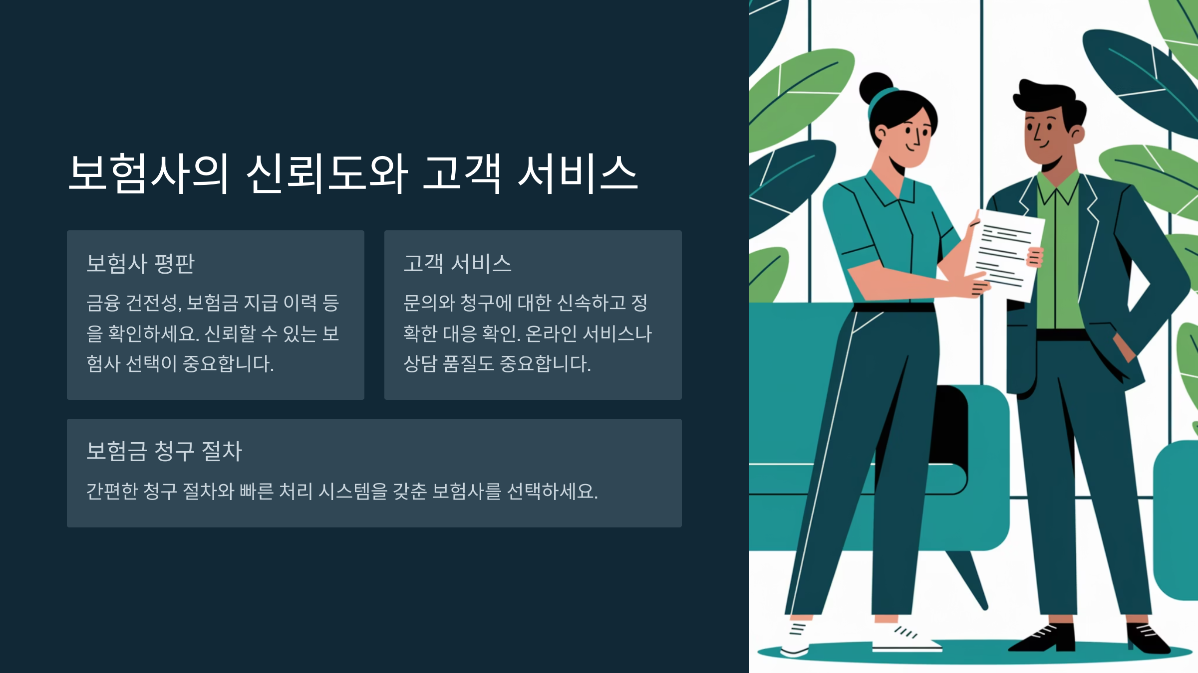 • 보험사 평판: 보험사의 금융 건전성, 보험금 지급 이력 등을 확인하여 신뢰할 수 있는 보험사를 선택하세요.