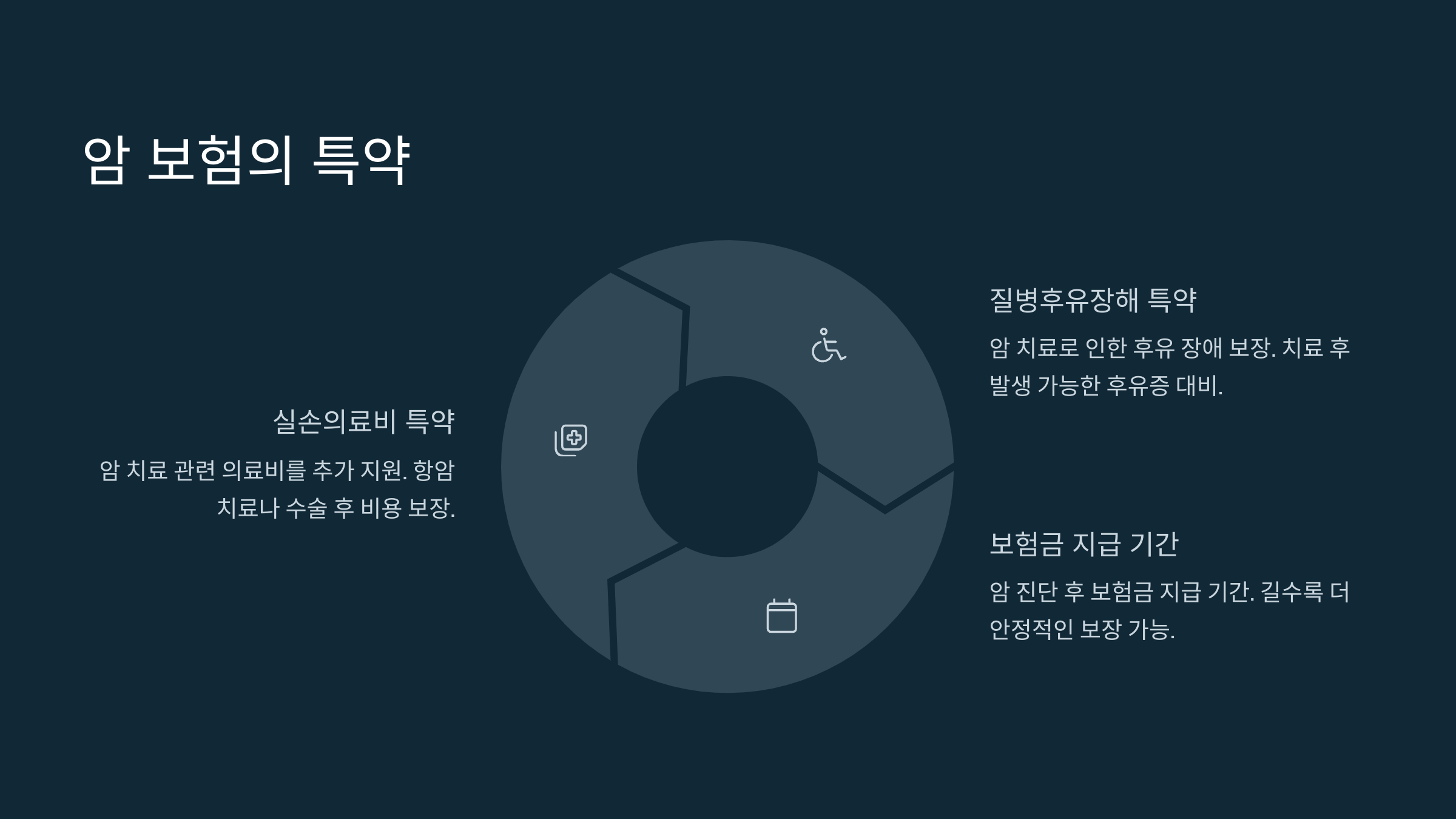 • 질병후유장해 특약: 암 치료로 인해 발생할 수 있는 후유 장애를 보장하는 특약입니다. 치료 후 발생할 수 있는 후유증에 대비해 보장 범위를 확장할 수 있습니다.