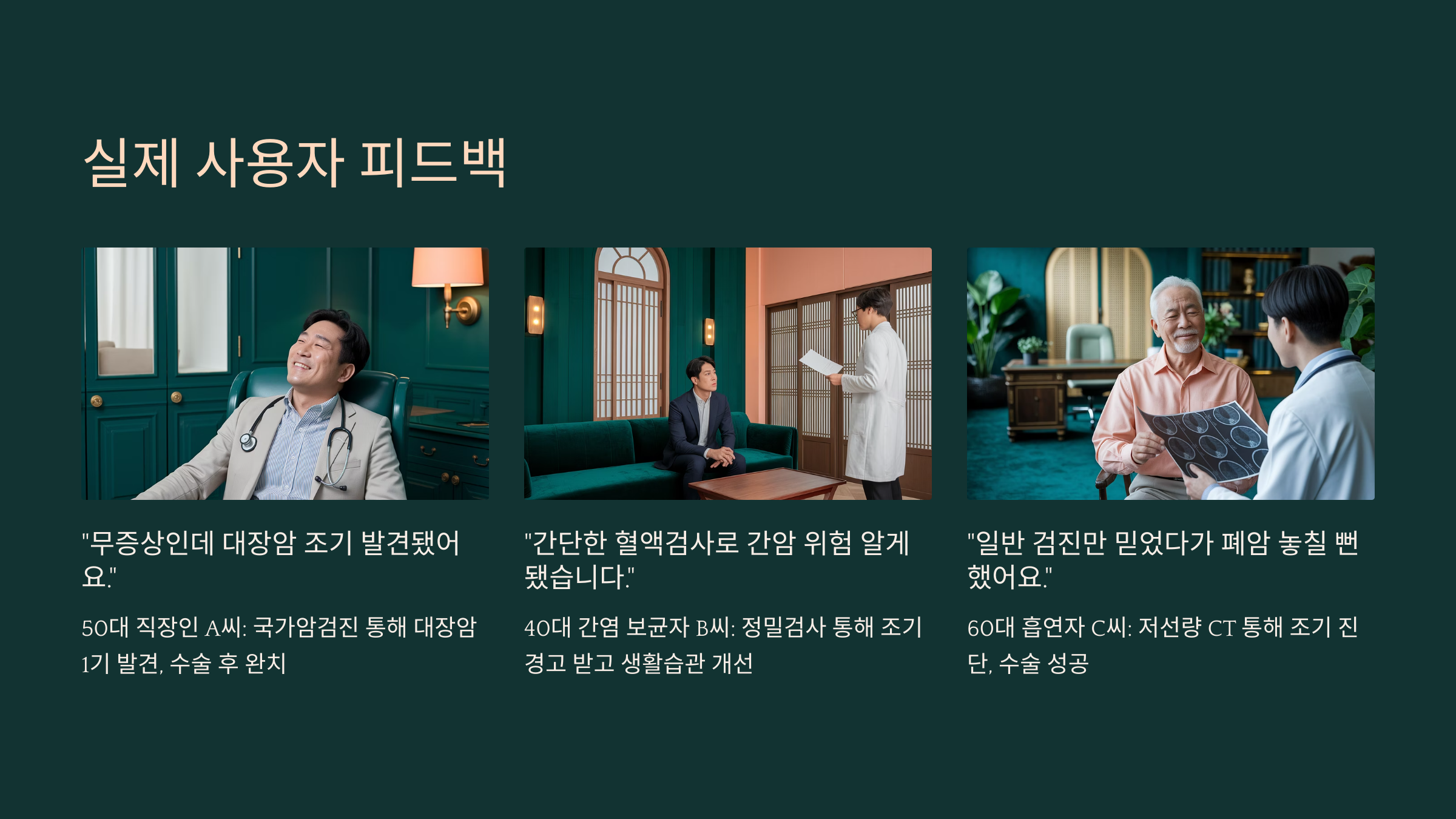 – 50대 직장인 A 씨: 국가암검진 통해 대장암 1기 발견, 수술 후 완치 - “간단한 혈액검사로 간암 위험 알게 됐습니다.”