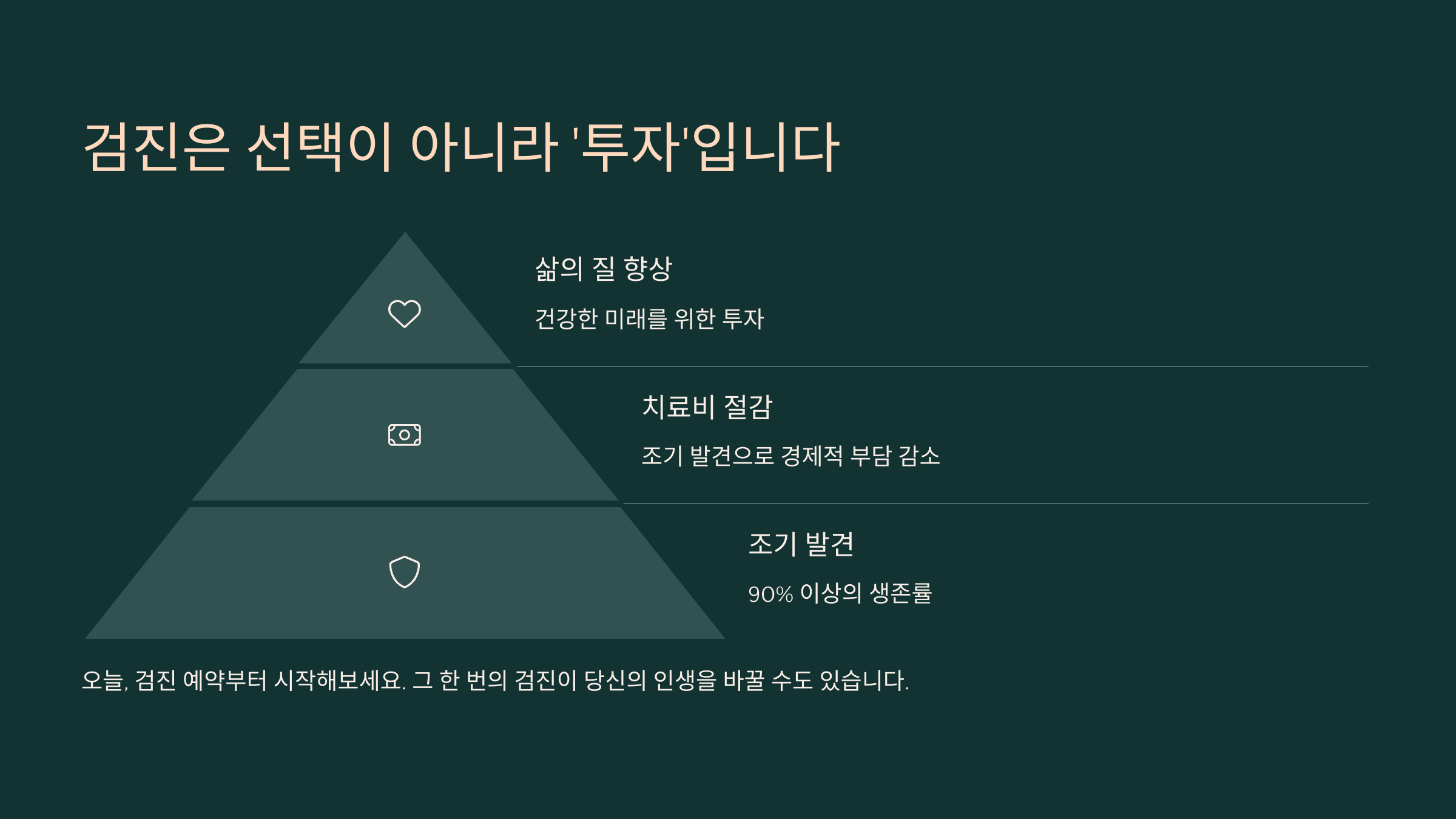 오늘, 검진 예약부터 시작해 보세요. 그 한 번의 검진이 당신의 인생을 바꿀 수도 있습니다.