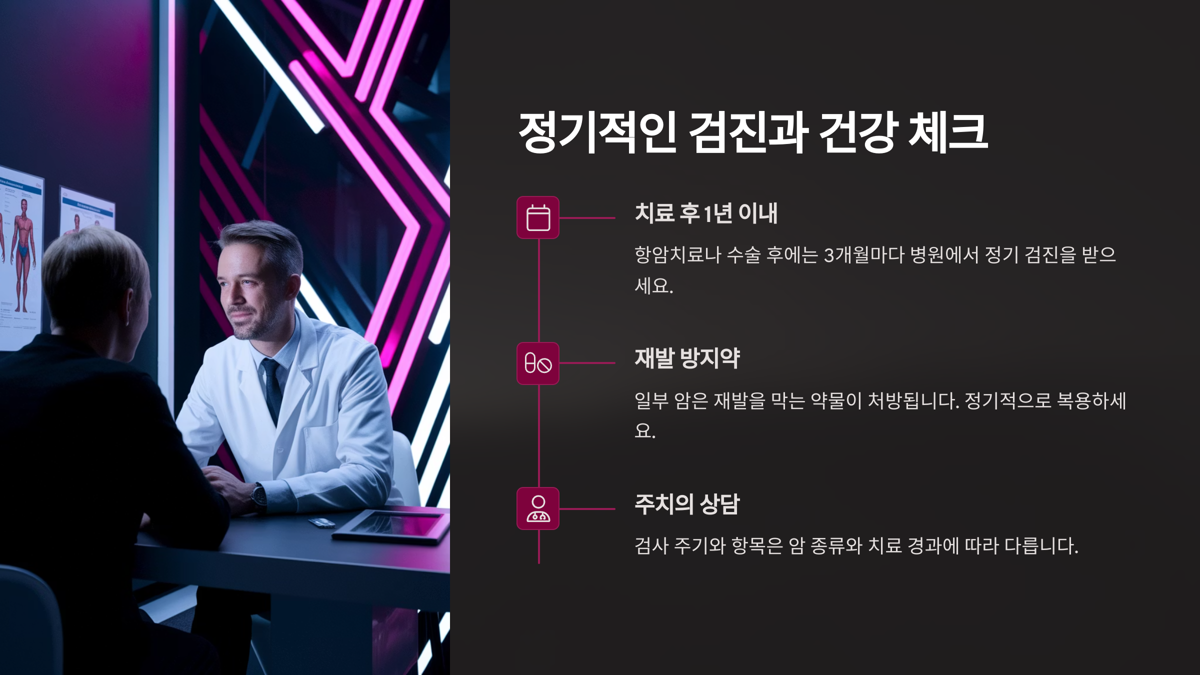 - 치료 후 1년 이내: 항암치료나 수술을 받은 후에는 3개월마다 병원에서의 정기 검진을 추천합니다.