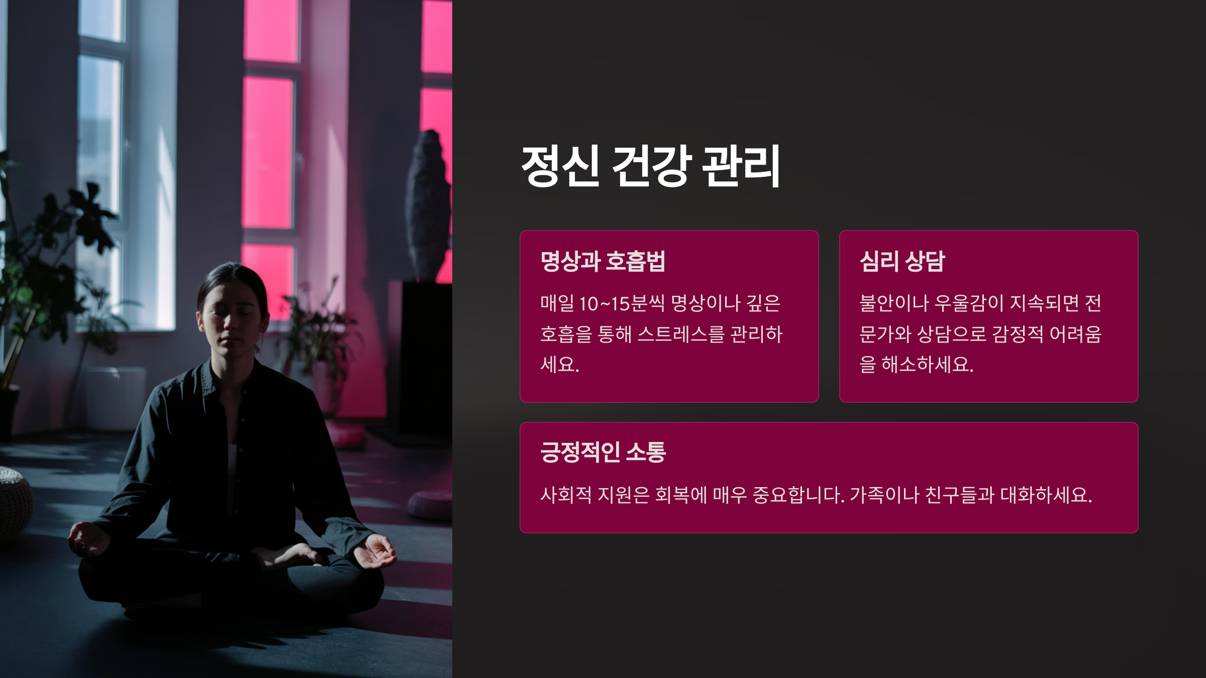 - 명상과 호흡법: 매일 10~15분씩 명상이나 깊은 호흡을 통해 스트레스를 관리하세요.