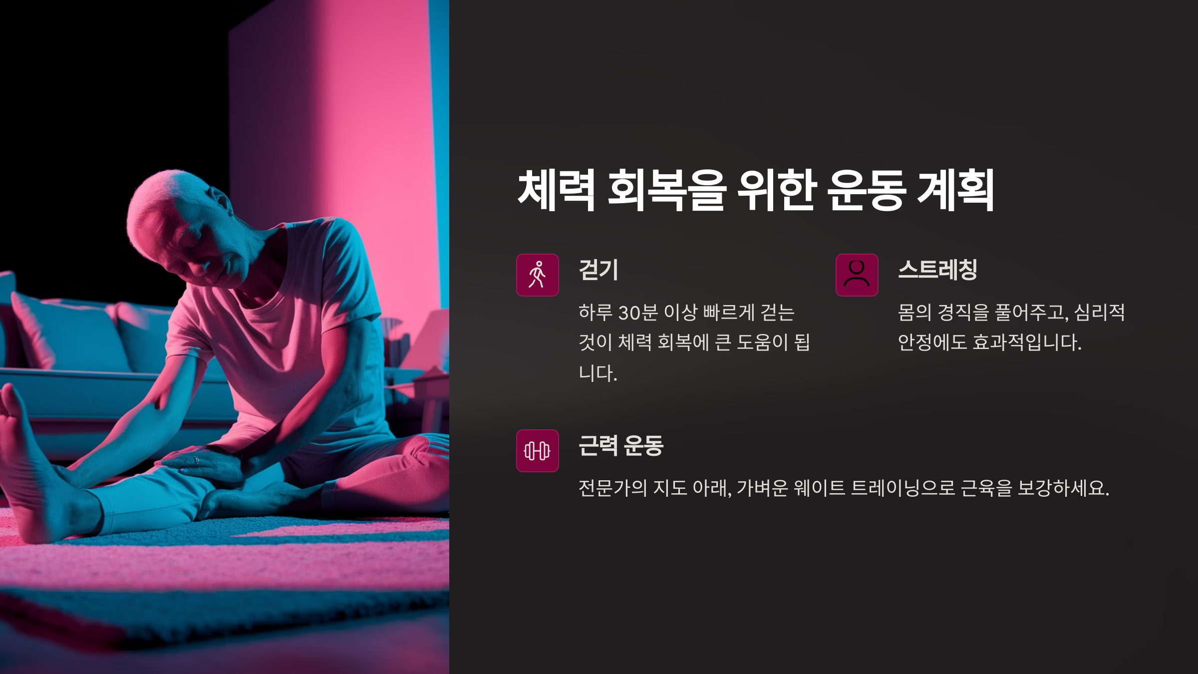 암 치료로 체력이 많이 떨어지기 때문에, 회복을 위해서는 규칙적인 운동이 매우 중요합니다. 하지만 초기에는 과도한 운동은 오히려 역효과를 불러올 수 있기 때문에, 자신에게 맞는 운동 강도를 찾는 것이 우선입니다.