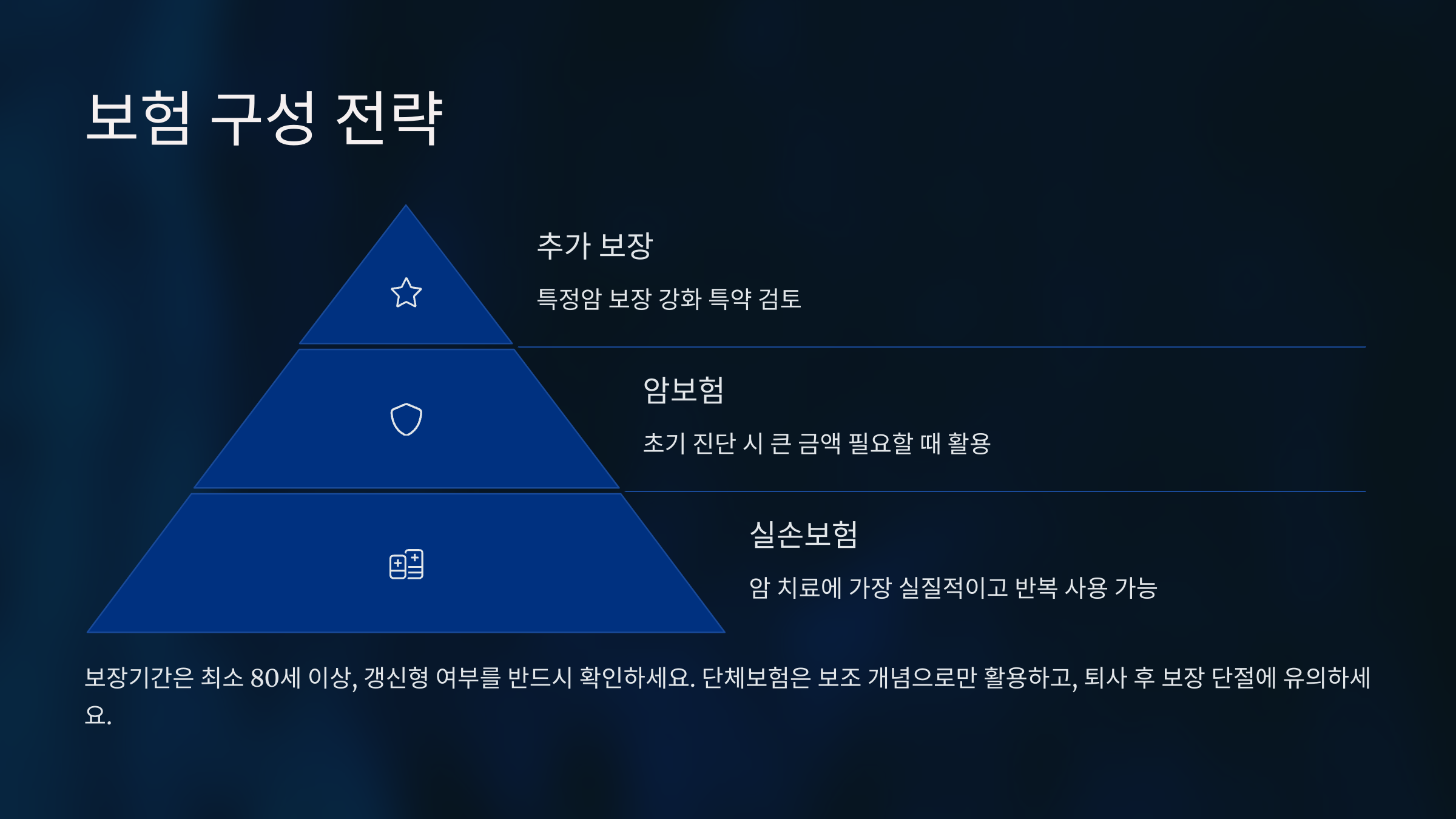 보장기간은 최소 80세 이상, 갱신형 여부 반드시 확인하시고, 가족력이나 기존 질환이 있다면 특정암 보장 강화 특약도 검토하세요.