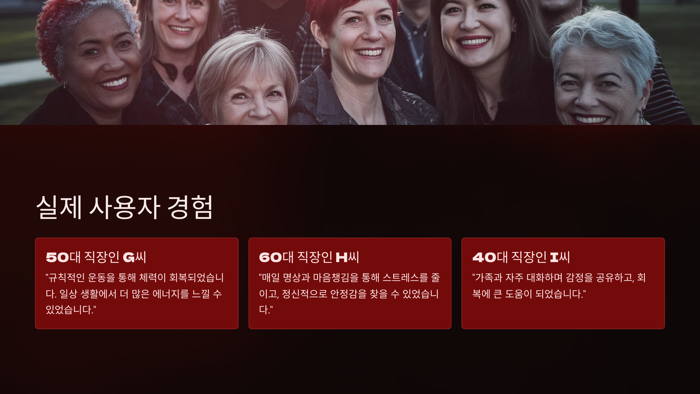– 50대 직장인 G 씨: 운동을 꾸준히 하여 체력을 회복하고, 일상생활에서 더 많은 에너지를 느낄 수 있음 - “명상을 통해 마음의 평화를 찾았습니다.”