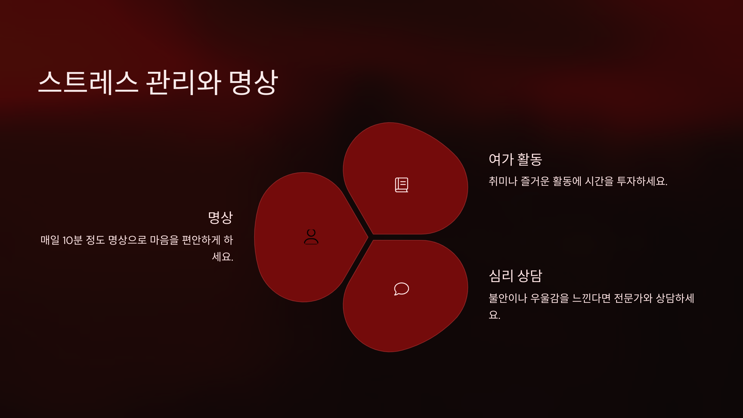 - 명상: 매일 10분 정도 명상을 통해 마음을 편안하게 하고, 정신적인 스트레스를 줄일 수 있습니다.