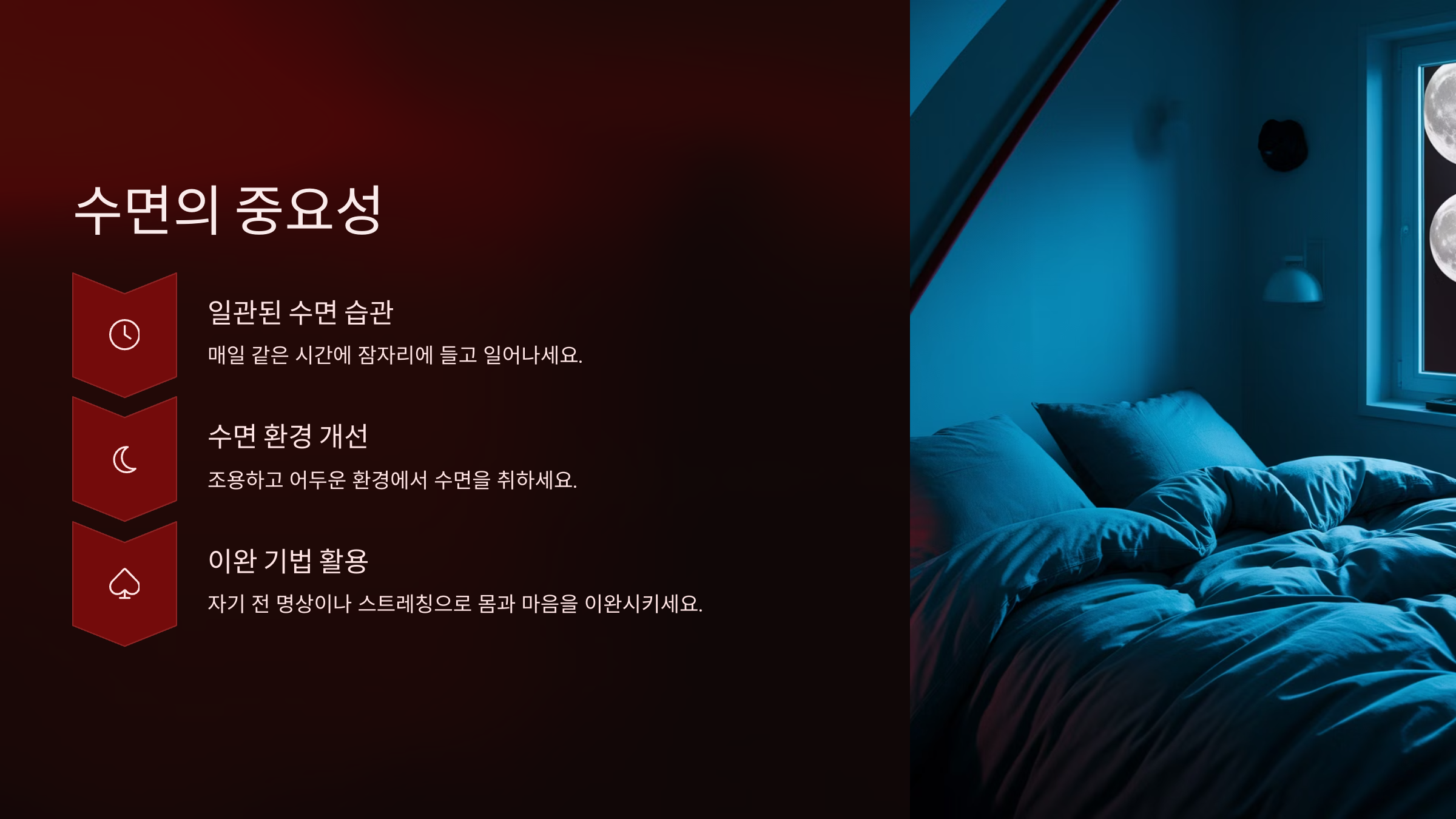 - 수면 환경 개선: 조용하고 어두운 환경에서 수면을 취하세요. 또한, 잠자리에서 전자기기 사용을 피하는 것이 좋습니다.