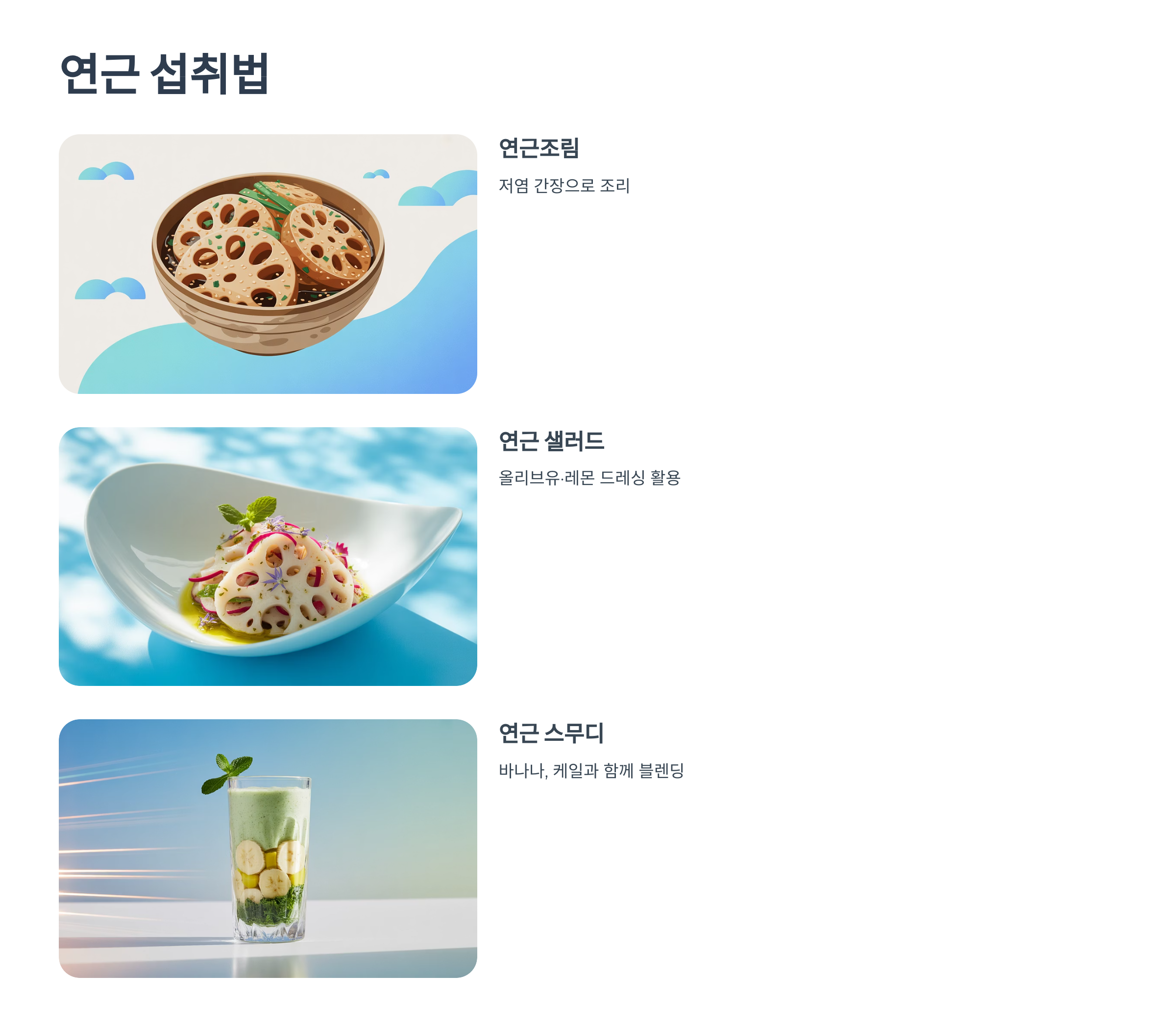 - 연근 샐러드: 삶은 연근에 올리브유·레몬 드레싱 활용