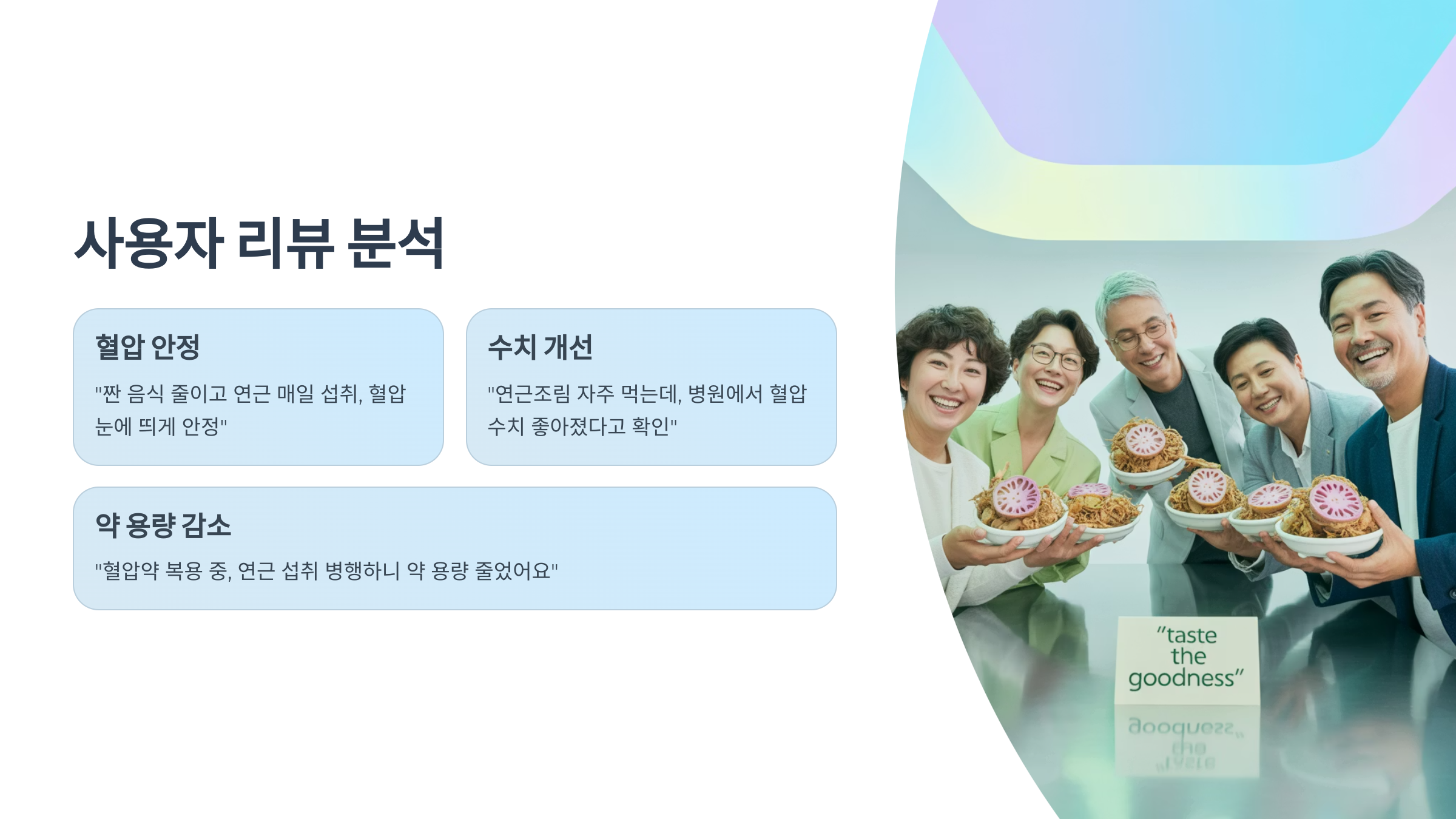 - “짠 음식을 줄이고 연근을 매일 섭취했더니 혈압이 눈에 띄게 안정됐어요.”