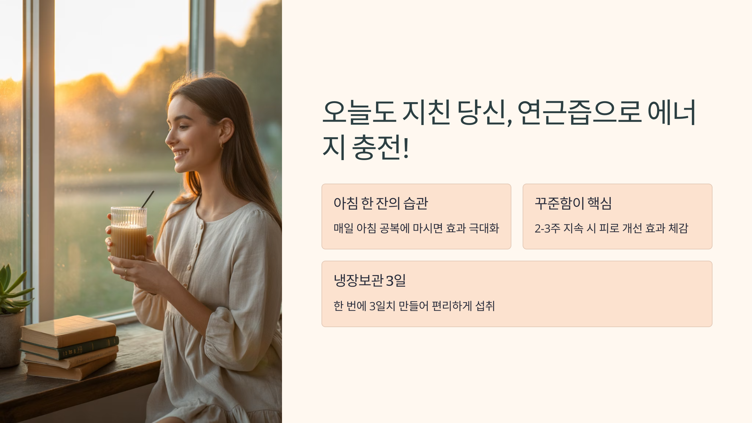 자연이 준 피로 해소 음료, 연근즙. 매일 아침 한 잔으로 피로를 벗어나보세요. 실천은 어렵지 않습니다. 꾸준함이 답입니다.