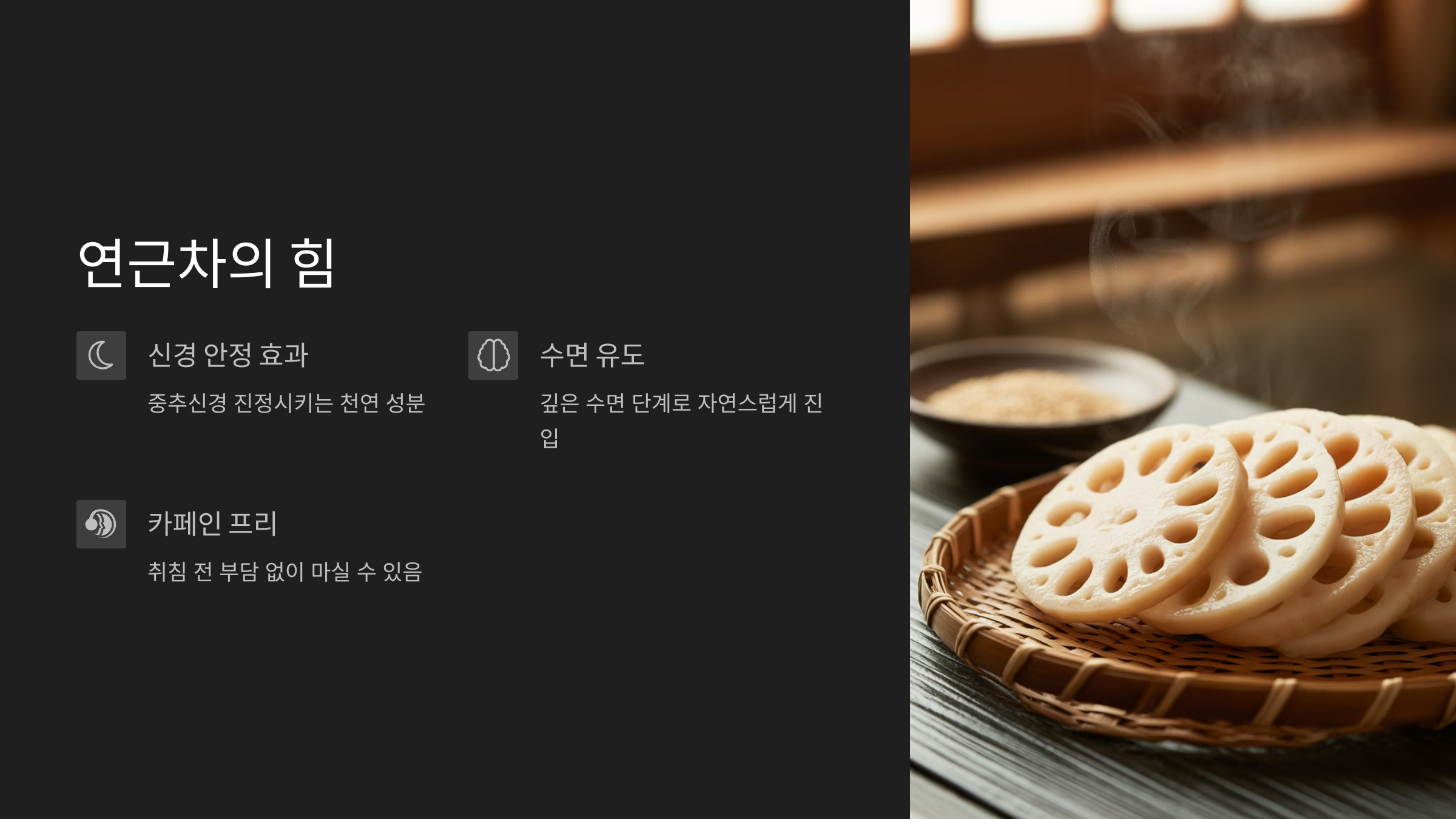 매일 밤, 연근차 한 잔의 루틴은 당신의 수면 패턴을 부드럽게 변화시킬 수 있습니다. 오늘부터 차근차근 시작해 보세요.