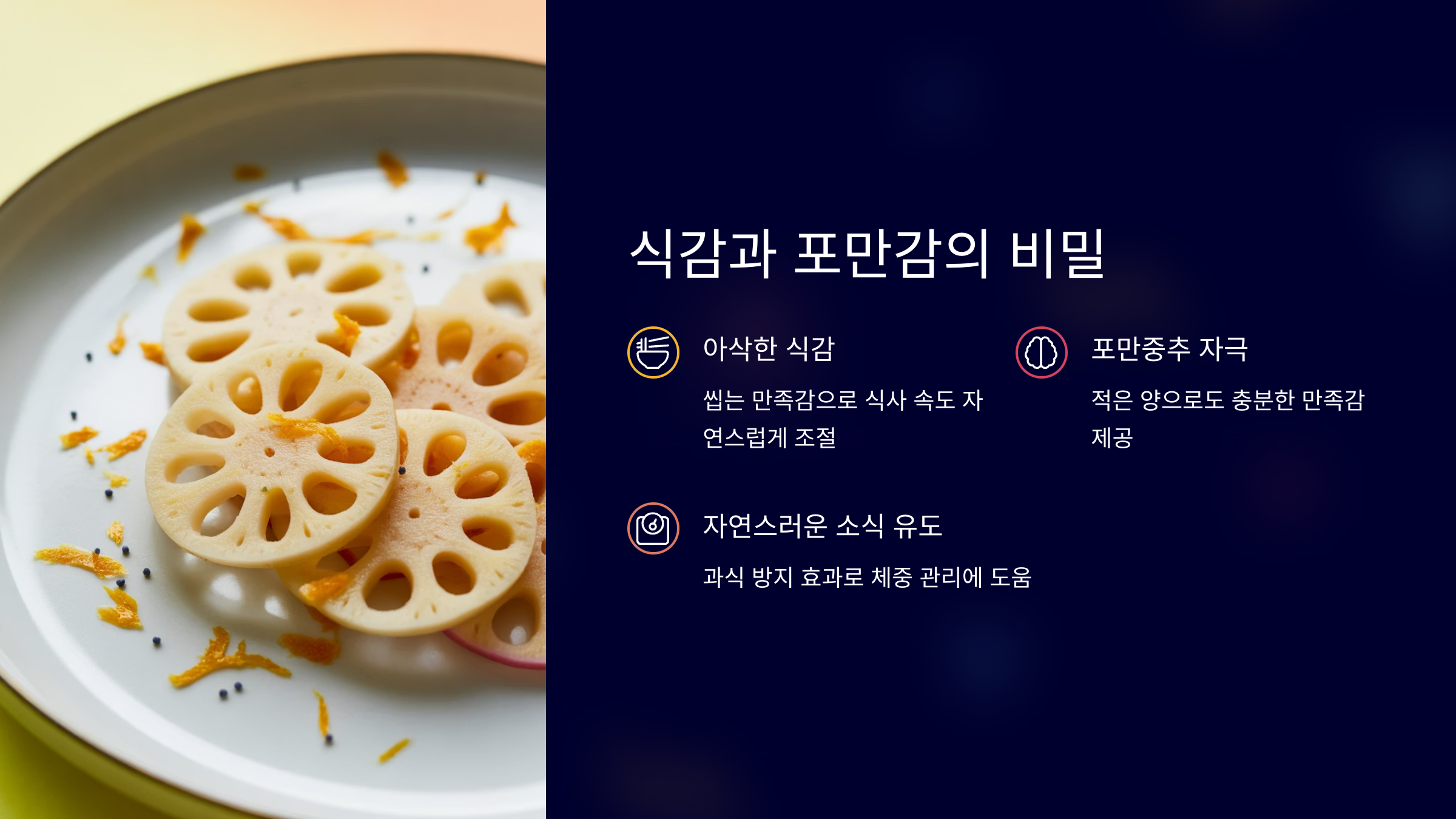 연근은 아삭한 식감 덕분에 포만중추를 자극해 소식(少食)을 유도합니다.
