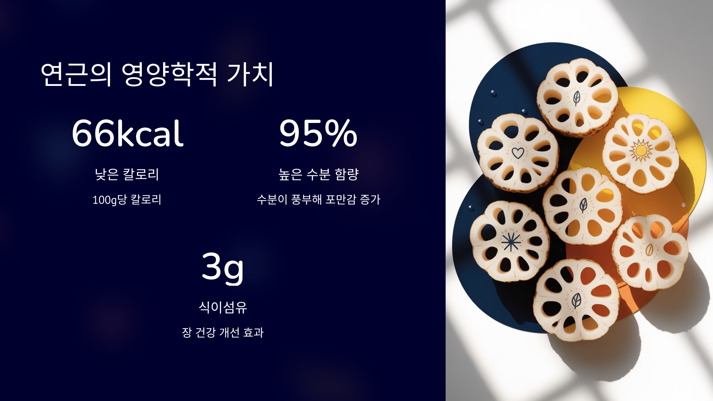 잠은 보약이라 했지만, 40대를 넘기며 쉽게 잠들지 못하고 자주 깨는 분들이 많습니다. 약에 의존하지 않고도 불면증을 완화할 수 있을까요? 해답은 자연에 있습니다. 연근차는 신경을 안정시키고 깊은 수면을 유도하는 천연 수면 보조제입니다. 또한 다이어트를 하면서 식감도 챙기고 싶다면, 아삭한 연근샐러드를 추천합니다. 포만감을 오래 유지해 과식을 줄여주는 똑똑한 다이어트 식품이죠. 연근을 활용하는 식습관으로 건강한 생활에 도움이 됐으면 합니다.