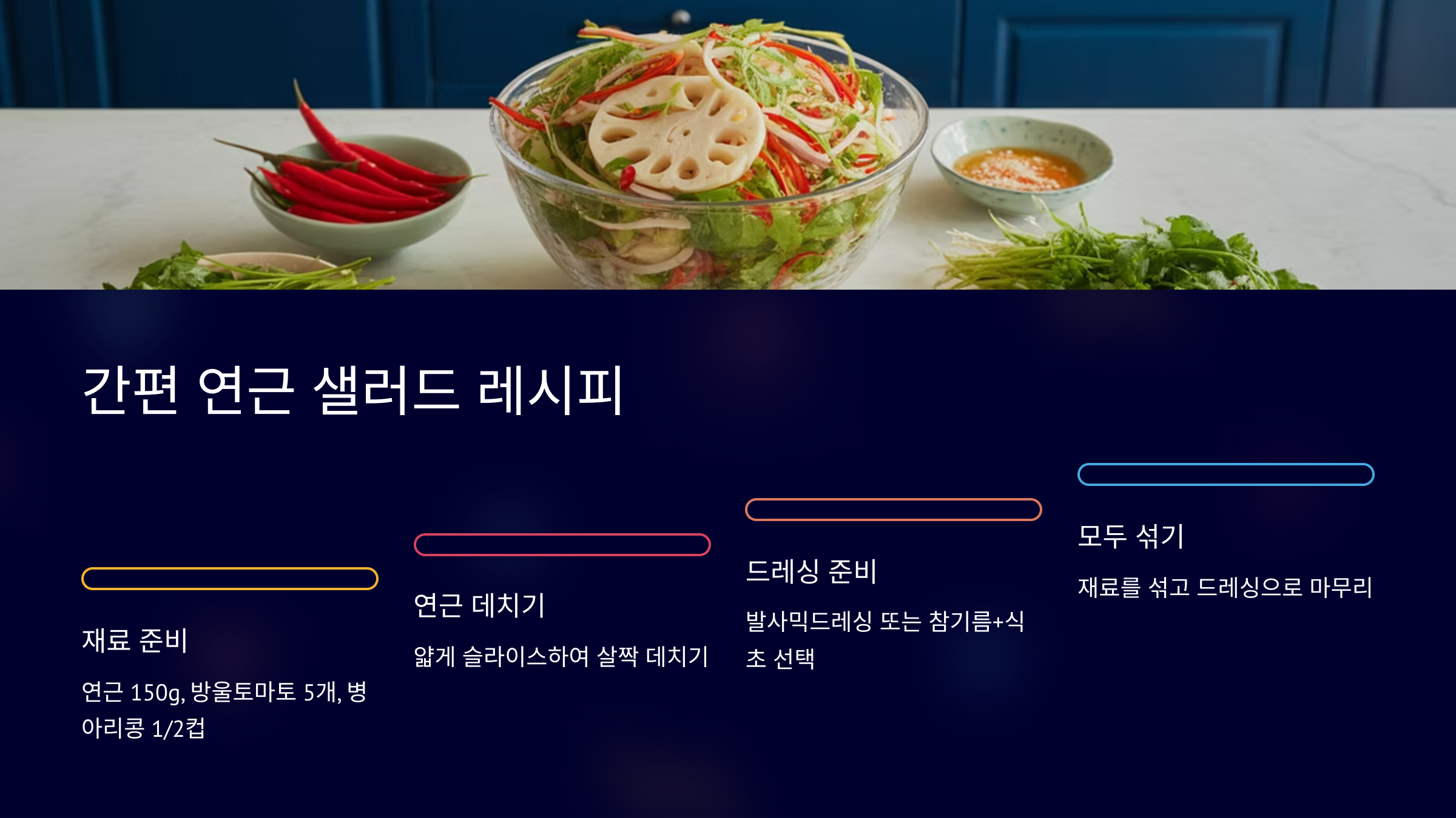 그리고 다이어트는 꾸준함이 관건입니다. 연근샐러드처럼 맛과 영양을 모두 갖춘 식단을 선택해 보세요.