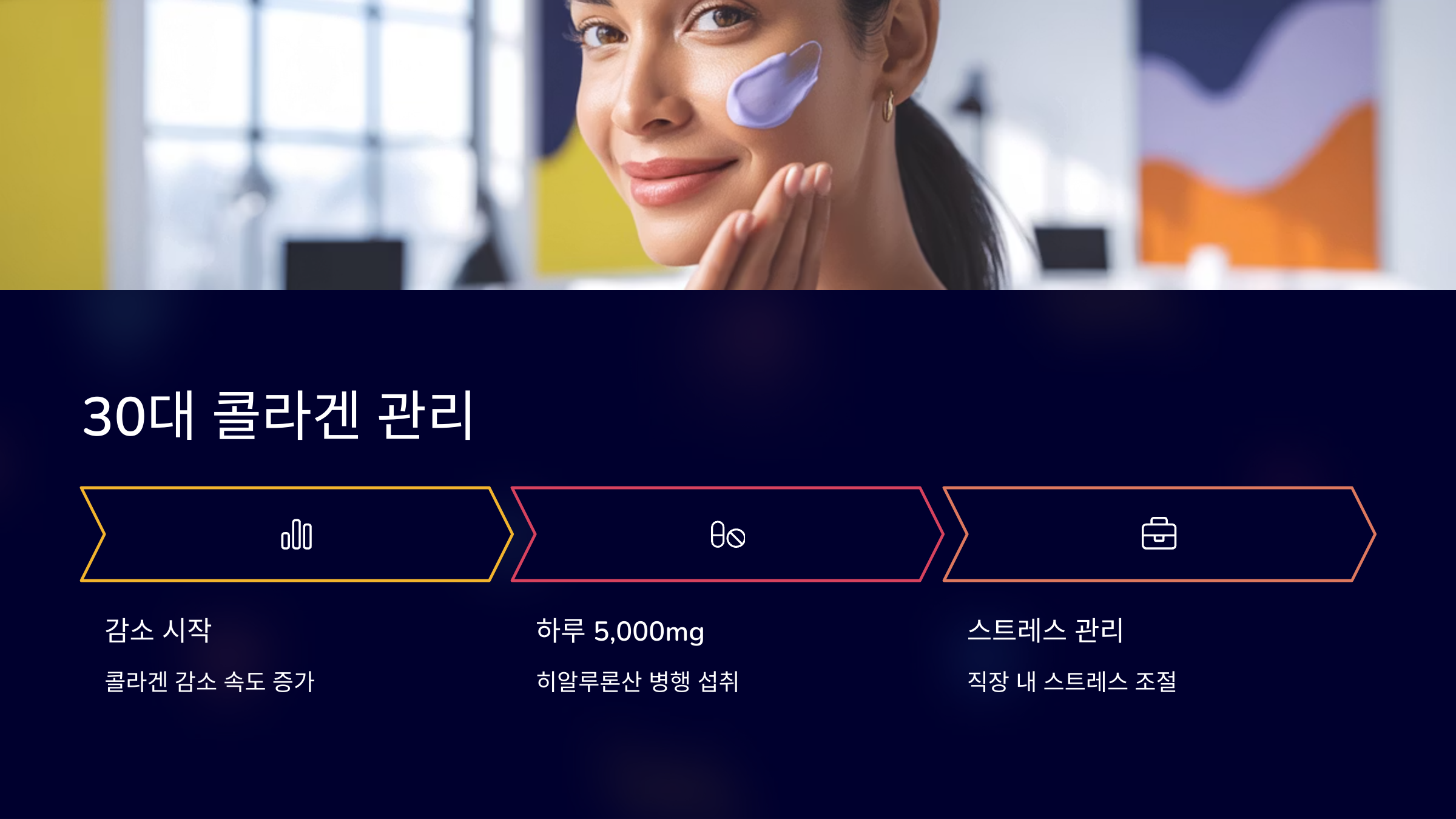 30대부터는 콜라겐 감소 속도가 빨라집니다. 하루 5,000mg 이상 섭취가 권장되며, 히알루론산, 엘라스틴 등 보조 성분과의 병행 섭취가 효과적입니다. 특히 직장 내 스트레스 관리도 병행해 피부 건강을 지켜야 합니다.