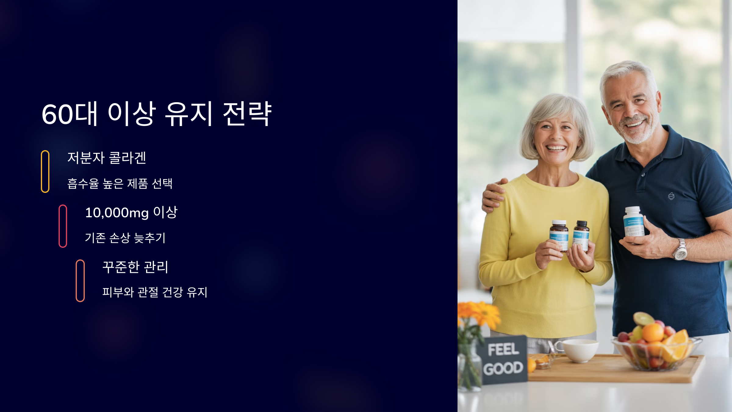 60대 이상은 콜라겐 생성이 매우 줄어든 상태로, 보충을 통해 기존 손상을 늦추고 피부 및 관절 건강을 유지하는 데 초점을 맞춰야 합니다. 하루 권장량은 10,000mg 이상이며, 흡수율 높은 저분자 콜라겐 제품 선택이 필수입니다.