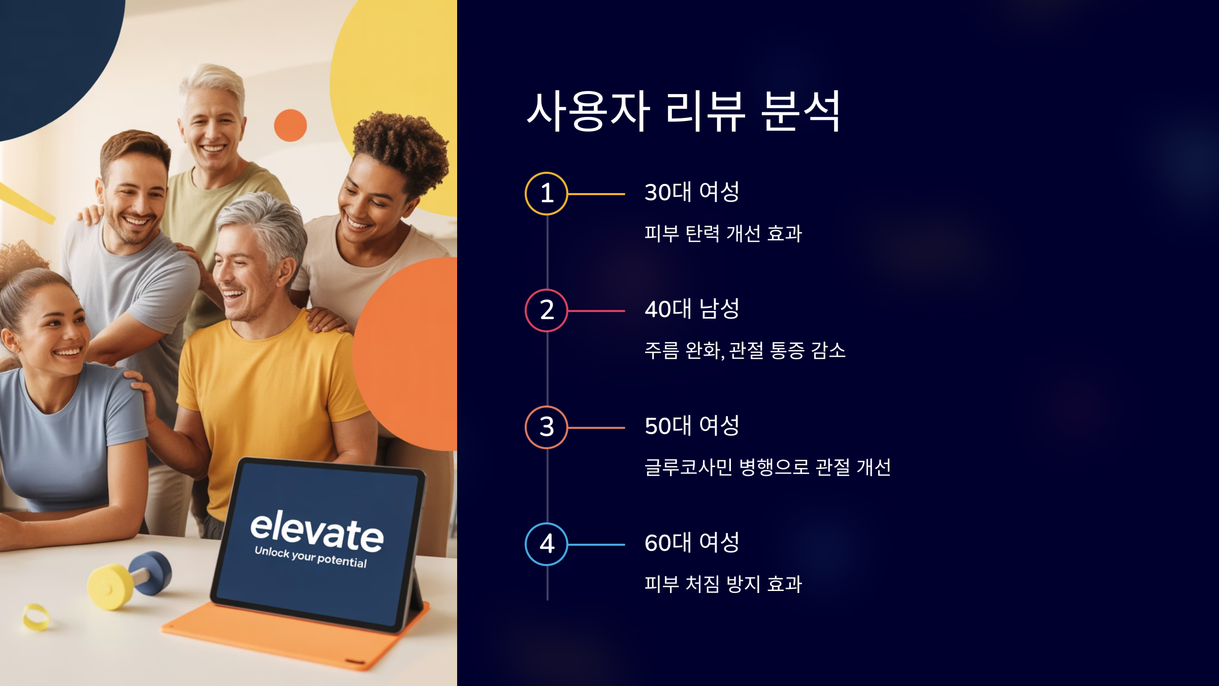 - “40대 중반부터 주름이 옅어지고 관절 통증도 완화됐습니다.” – 46세 남성