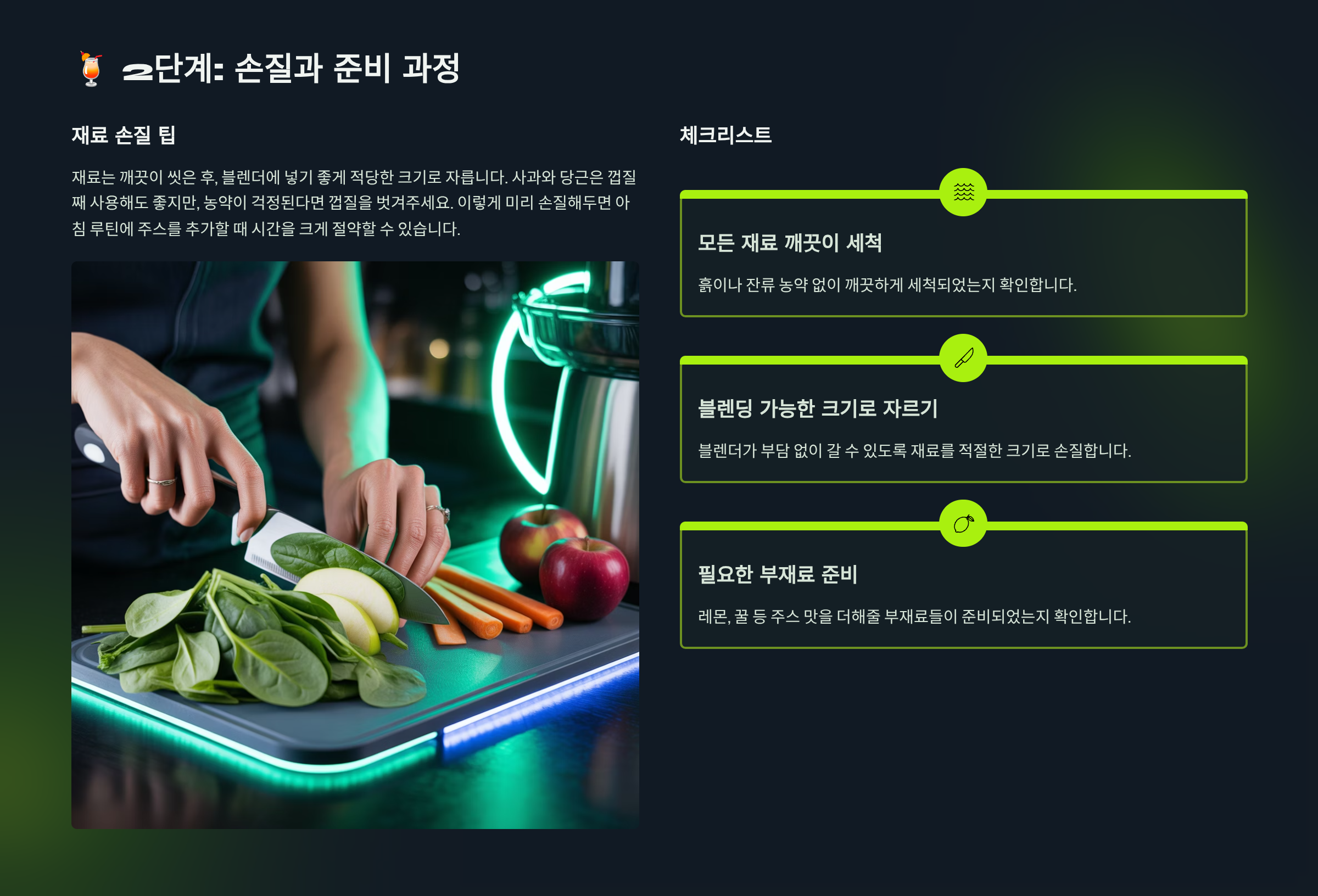2. 재료 선택, 손질, 블렌딩, 맛 조절, 보관까지 단계별 체크리스트 제공