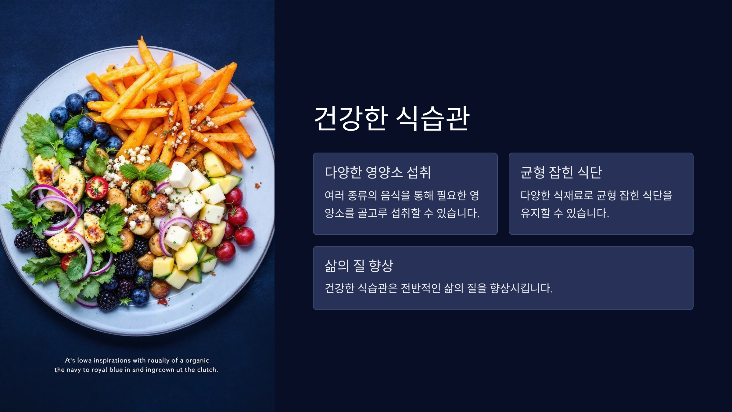 옴니보어는 건강한 식습관을 형성하는 데 기여합니다. 다양한 영양소를 섭취함으로써, 균형 잡힌 식단을 유지할 수 있습니다. 이는 우리의 몸과 마음을 건강하게 유지하는 데 필수적입니다. 건강한 식습관은 삶의 질을 높이는 중요한 요소입니다. 예를 들어, 다양한 과일과 채소를 포함한 식단은 비타민과 미네랄을 충분히 공급하여 면역력을 높이고, 전반적인 건강을 증진시킵니다.