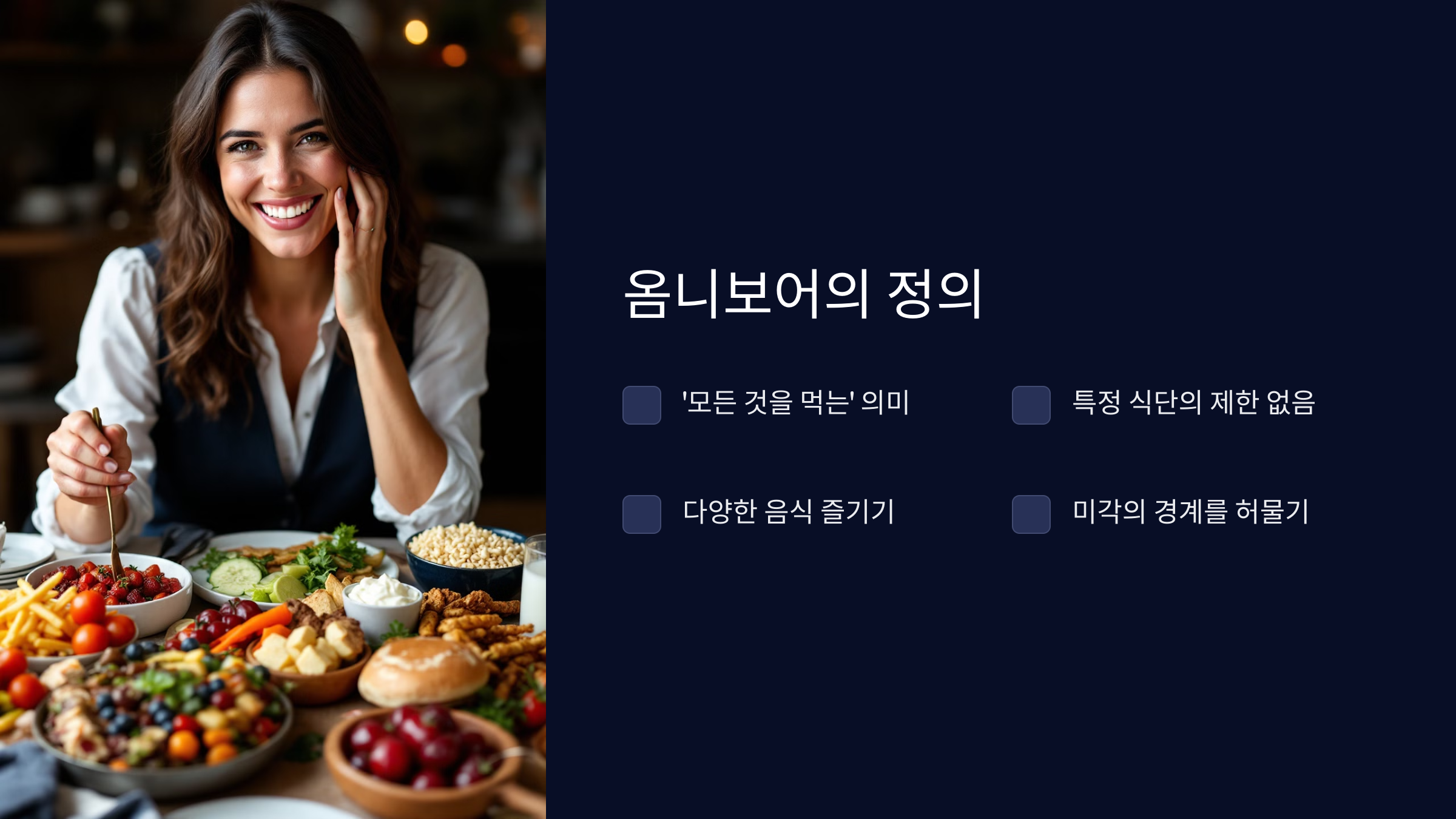 현대 사회는 글로벌화와 함께 다양한 문화가 공존하는 시대입니다. 이러한 변화 속에서 '옴니보어'라는 개념이 주목받고 있습니다. 옴니보어는 단순히 여러 음식을 먹는 것을 넘어, 다양한 문화와의 연결을 통해 새로운 경험을 창출하는 식문화의 혁신입니다. 이는 마치 여러 색깔의 물감이 어우러져 아름다운 그림을 그리는 것과 같습니다. 옴니보어는 우리의 식탁을 풍성하게 하고, 미각의 경계를 허물며, 서로 다른 문화의 아름다움을 경험하게 합니다. 이 글에서는 옴니보어의 의미와 그 중요성, 그리고 우리의 삶에 미치는 영향을 깊이 있게 탐구해 보겠습니다.