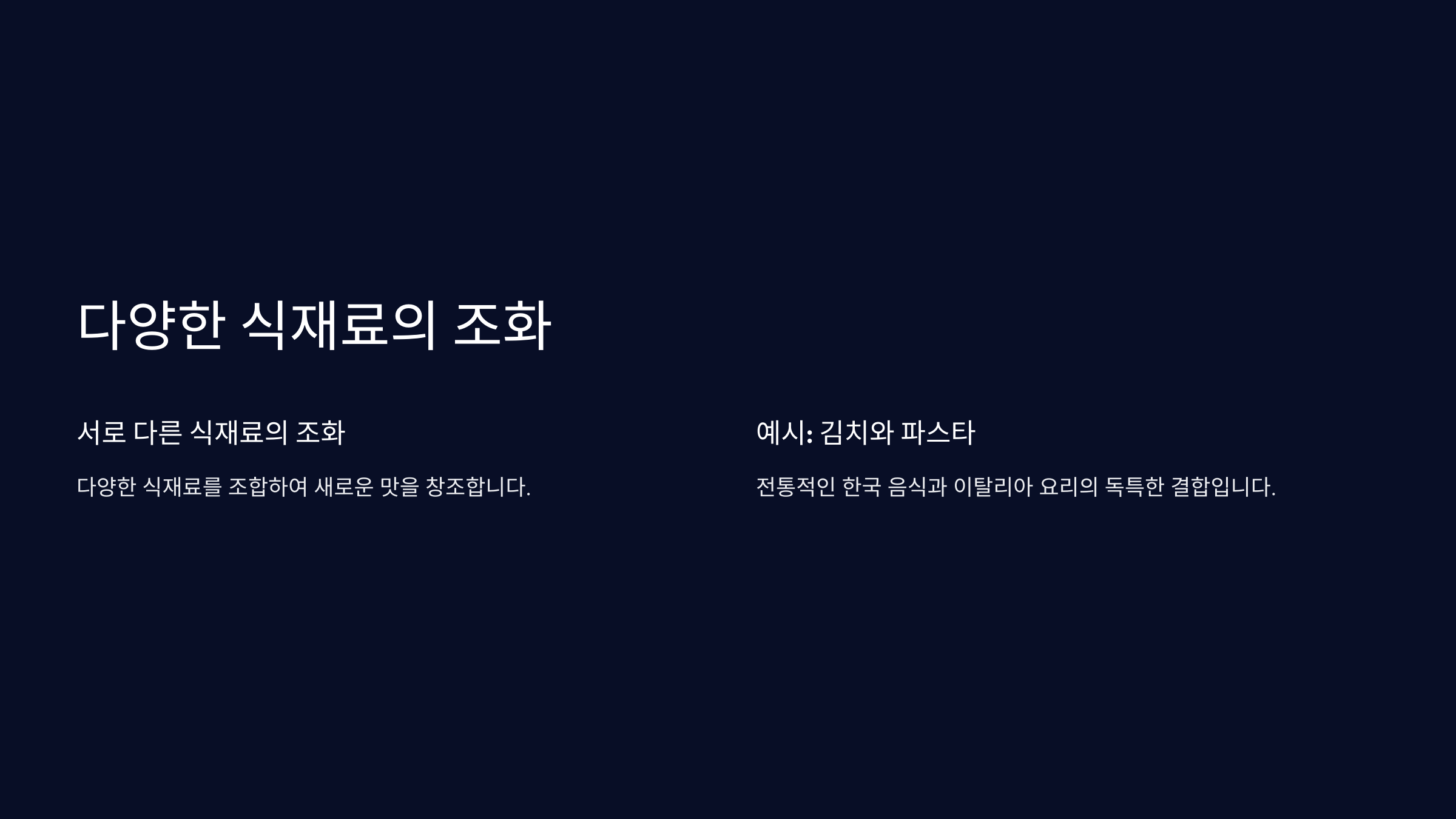 옴니보어는 다양한 식재료의 조화를 강조합니다. 예를 들어, 한국의 김치와 이탈리아의 파스타를 결합한 요리는 두 문화의 아름다움을 동시에 느낄 수 있게 합니다. 이러한 조화는 우리의 미각을 자극하고, 새로운 맛의 세계로 안내합니다. 각기 다른 식재료가 만나 새로운 맛을 창조하는 과정은 마치 두 사람의 사랑이 결실을 맺는 것과 같습니다. 이처럼 옴니보어는 다양한 식재료를 통해 우리의 식탁을 더욱 풍성하게 만들어 줍니다.