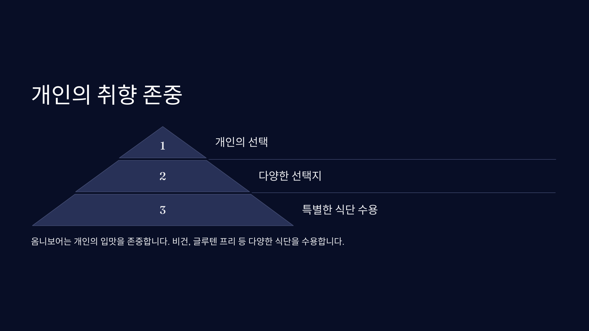 옴니보어는 개인의 취향을 존중하는 식문화입니다. 각자의 입맛에 맞는 음식을 선택할 수 있는 자유는 현대인의 삶에서 중요한 요소입니다. 이는 마치 각자의 색깔로 그려진 그림처럼, 다양한 맛의 조화가 이루어지는 것입니다. 개인의 취향을 존중하는 옴니보어는 우리에게 더 많은 선택의 기회를 제공합니다. 예를 들어, 비건, 글루텐 프리, 또는 특정 알레르기가 있는 사람들도 자신에게 맞는 다양한 음식을 즐길 수 있는 환경이 조성됩니다.