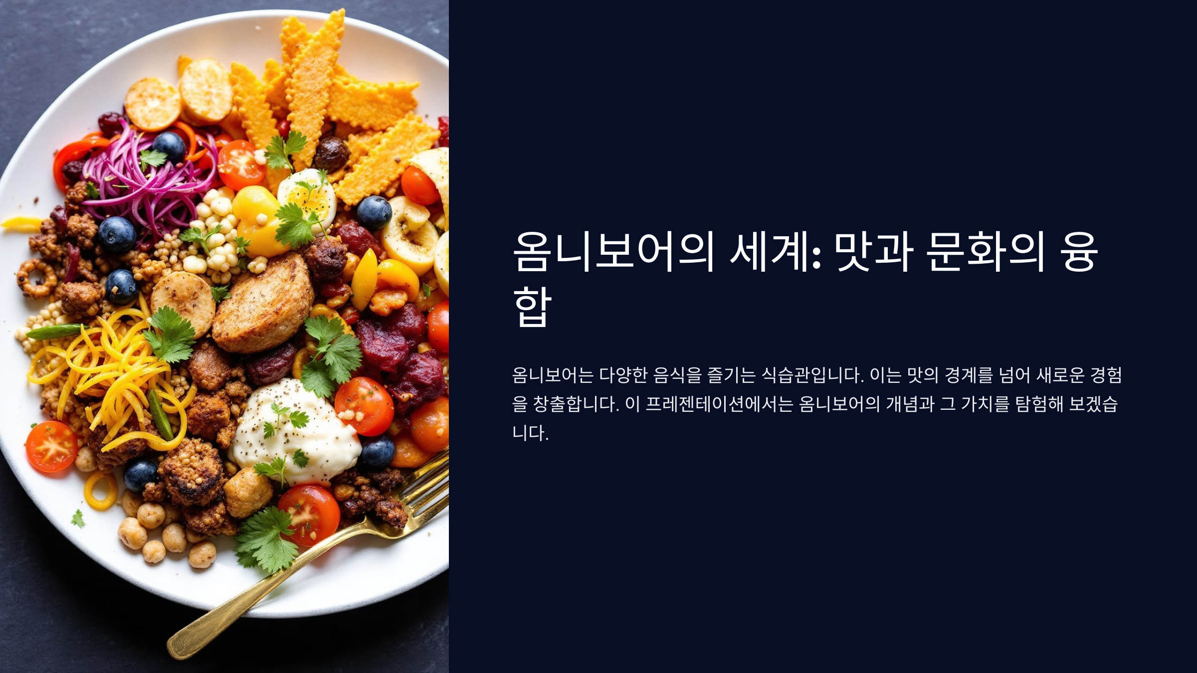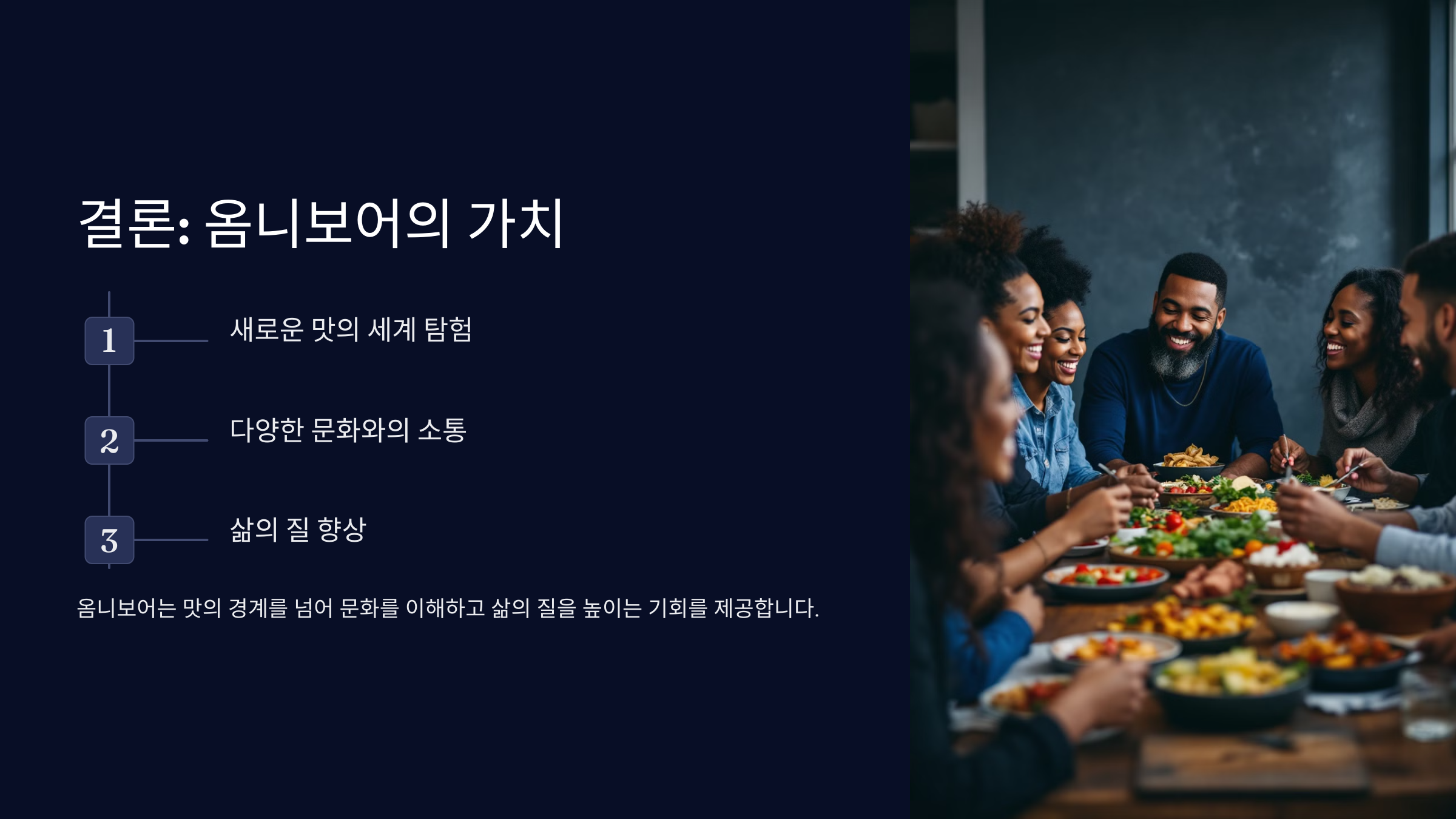 옴니보어는 단순한 식문화의 트렌드가 아닙니다. 이는 우리의 삶을 풍요롭게 하고, 다양한 문화와의 연결을 만들어주는 중요한 개념입니다. 다양한 식재료의 조화, 문화의 융합, 개인의 취향 존중, 지속 가능한 식문화, 그리고 건강한 식습관은 모두 옴니보어가 지향하는 가치입니다. 이제 우리는 옴니보어를 통해 새로운 맛의 세계를 탐험하고, 더 나아가 서로 다른 문화와의 소통을 즐길 수 있는 기회를 가지게 되었습니다. 옴니보어는 우리에게 무한한 가능성을 열어주는 열쇠입니다. 이 열쇠를 통해 더 넓은 세계로 나아가 보시기 바랍니다. 옴니보어의 세계는 여러분을 기다리고 있습니다. 다양한 맛의 세계로의 초대에 응하여, 새로운 경험을 통해 삶의 질을 높여보세요.