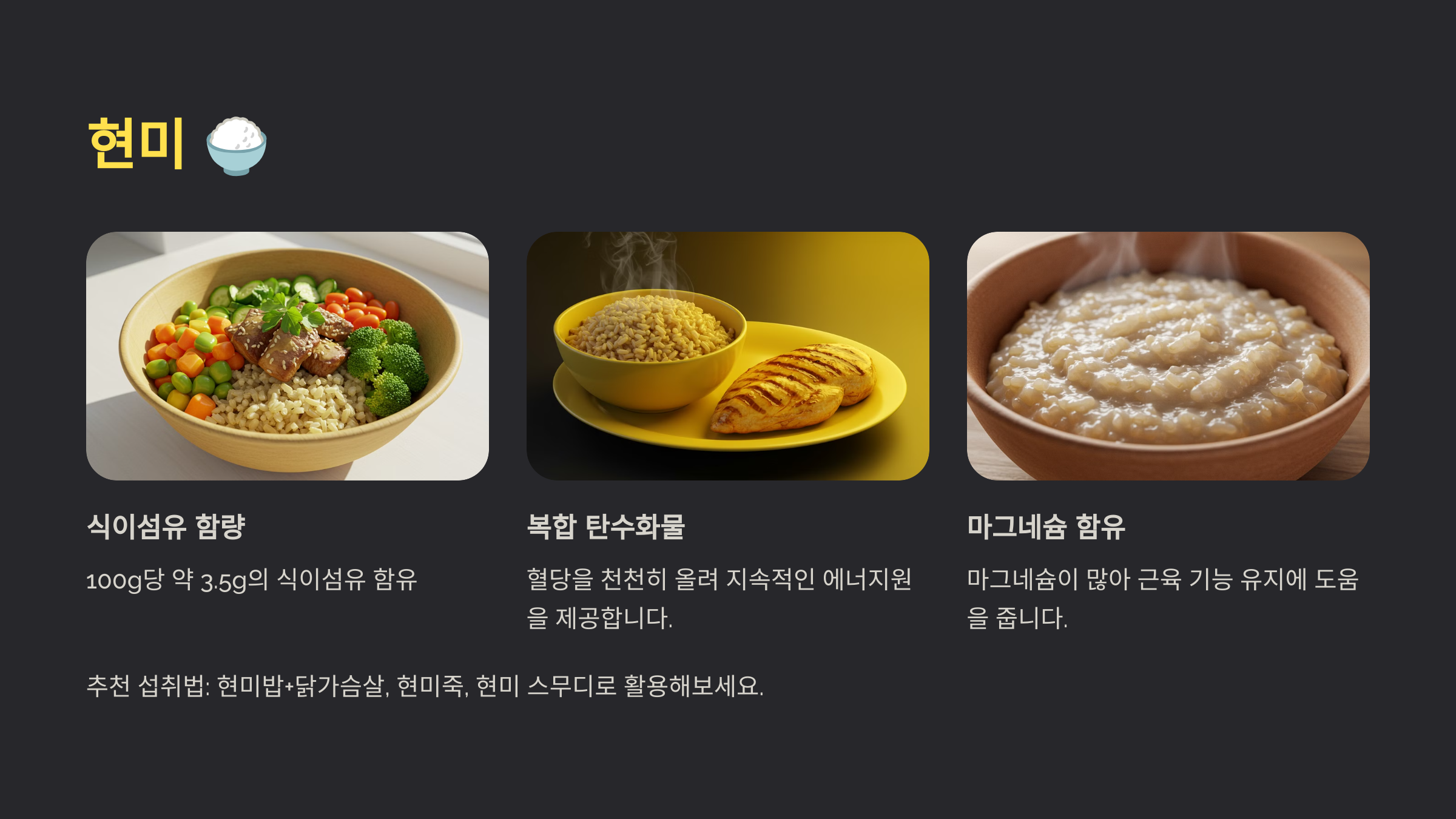 현미밥+닭가슴살, 현미죽, 현미 스무디