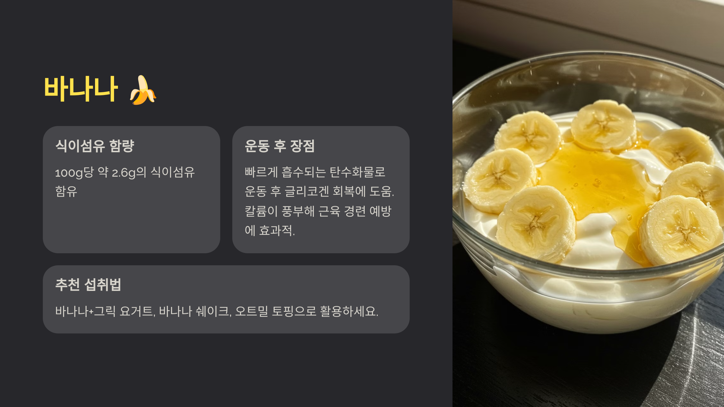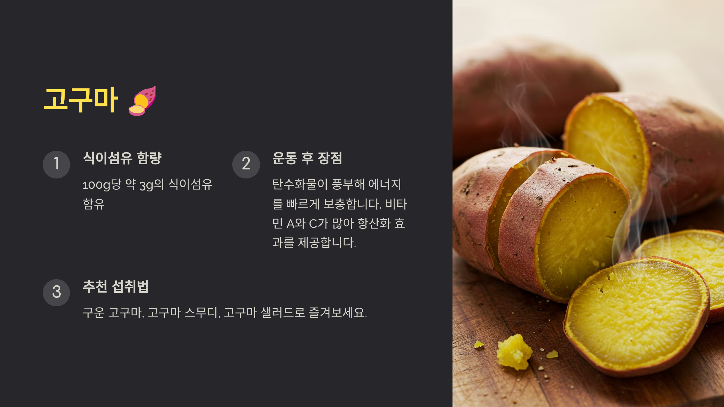 ✅ 운동 직후는 소화가 쉬운 식이섬유(바나나, 귀리) 위주로 선택