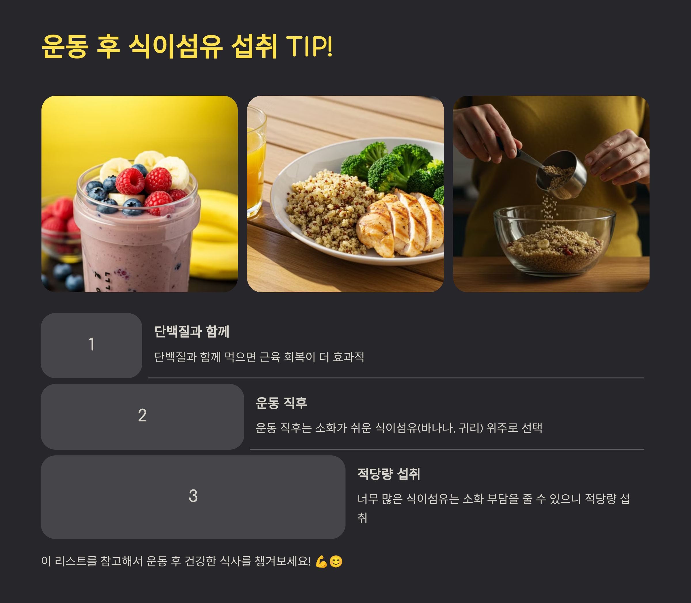 이 리스트를 참고해서 운동 후 건강한 식사를 챙겨보세요! 💪😊