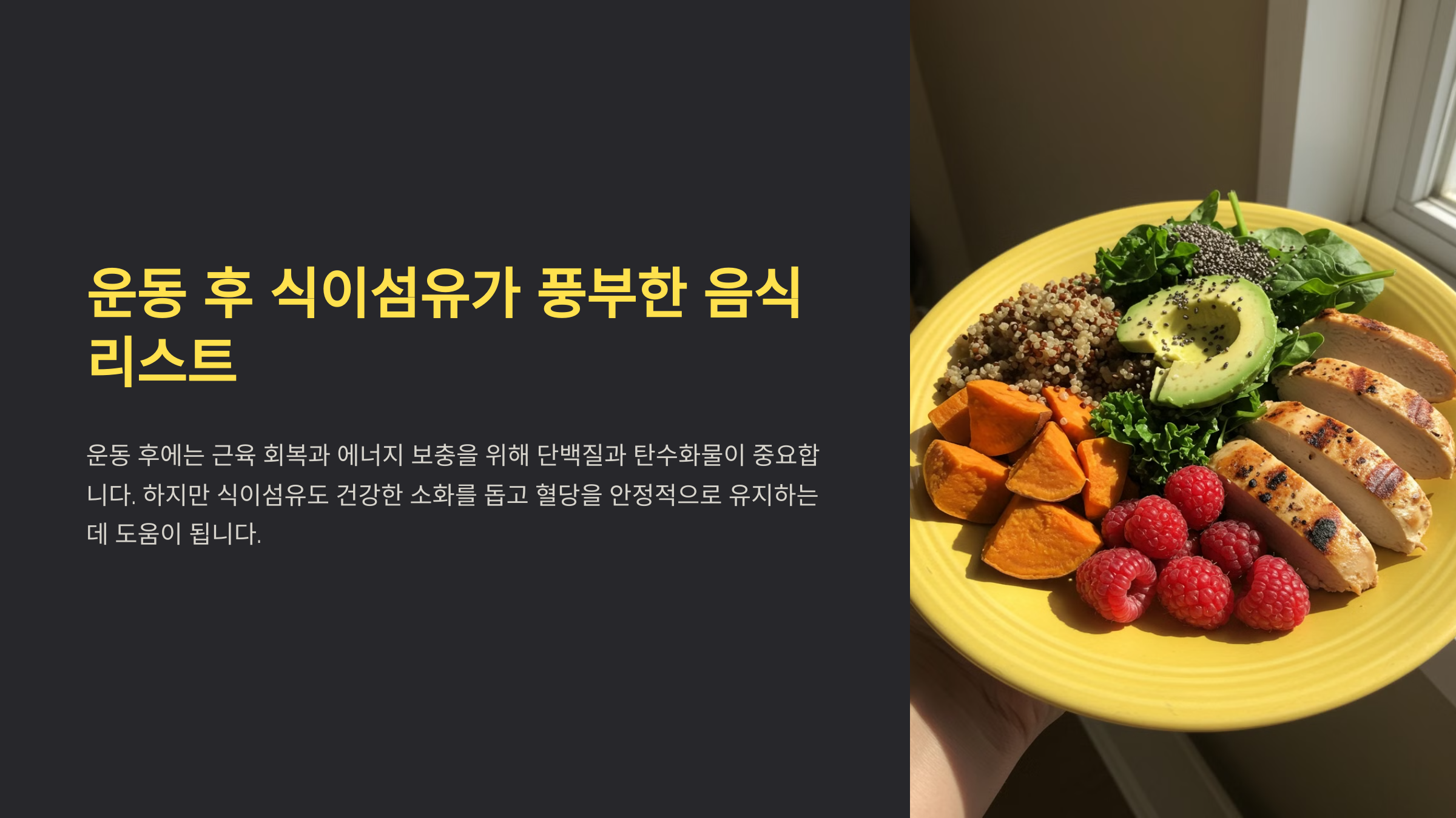 운동 후에는 근육 회복과 에너지 보충을 위해 단백질과 탄수화물이 중요하지만, 식이섬유도 건강한 소화를 돕고 혈당을 안정적으로 유지하는 데 도움이 됩니다. 운동 후 먹기 좋은 식이섬유가 풍부한 음식 리스트를 소개합니다.