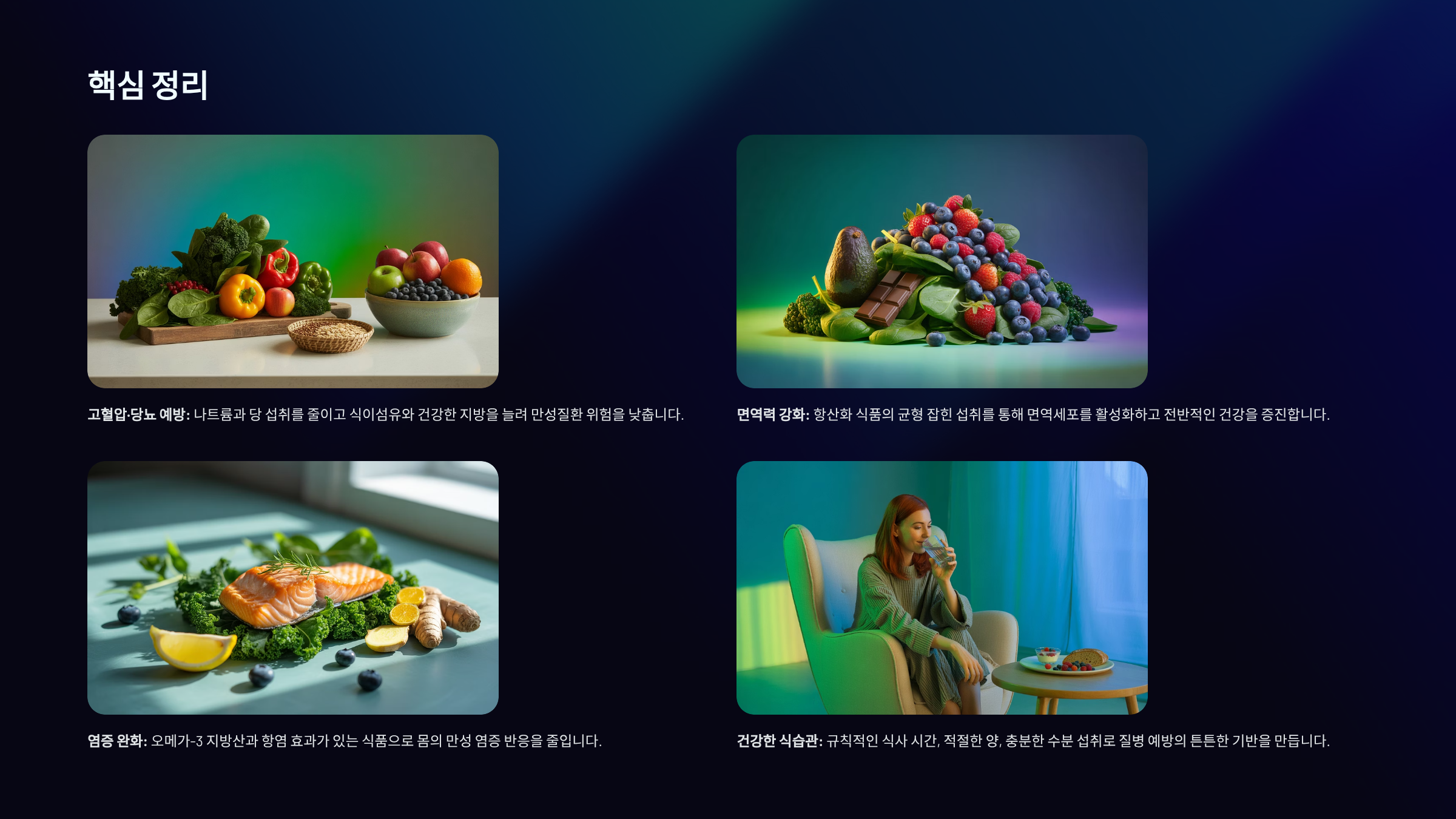 40대 이후 만성질환 위험이 높아지면서 질병 예방이 더욱 중요해졌습니다. 이 글에서는 고혈압과 당뇨를 피하는 식단 원칙, 항산화 식품 조합으로 면역력 높이기, 염증 완화에 좋은 항염 식이요법, 그리고 질병 예방을 돕는 건강한 식사 습관을 단계별로 구체적으로 설명합니다. 지금 바로 실천해 보세요.