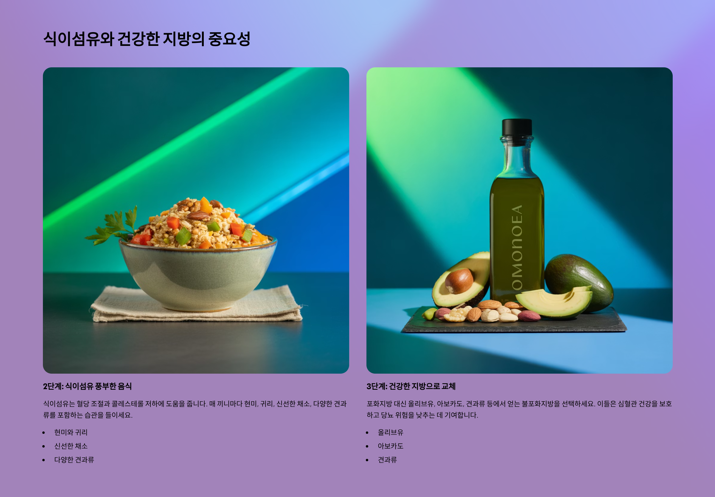 식이섬유는 혈당 조절과 콜레스테롤 저하에 도움을 줍니다. 현미, 귀리, 채소, 견과류를 매 끼니마다 포함하는 습관을 들이세요. 제가 직접 실천하며 혈당 변동이 안정되는 것을 경험했습니다.
