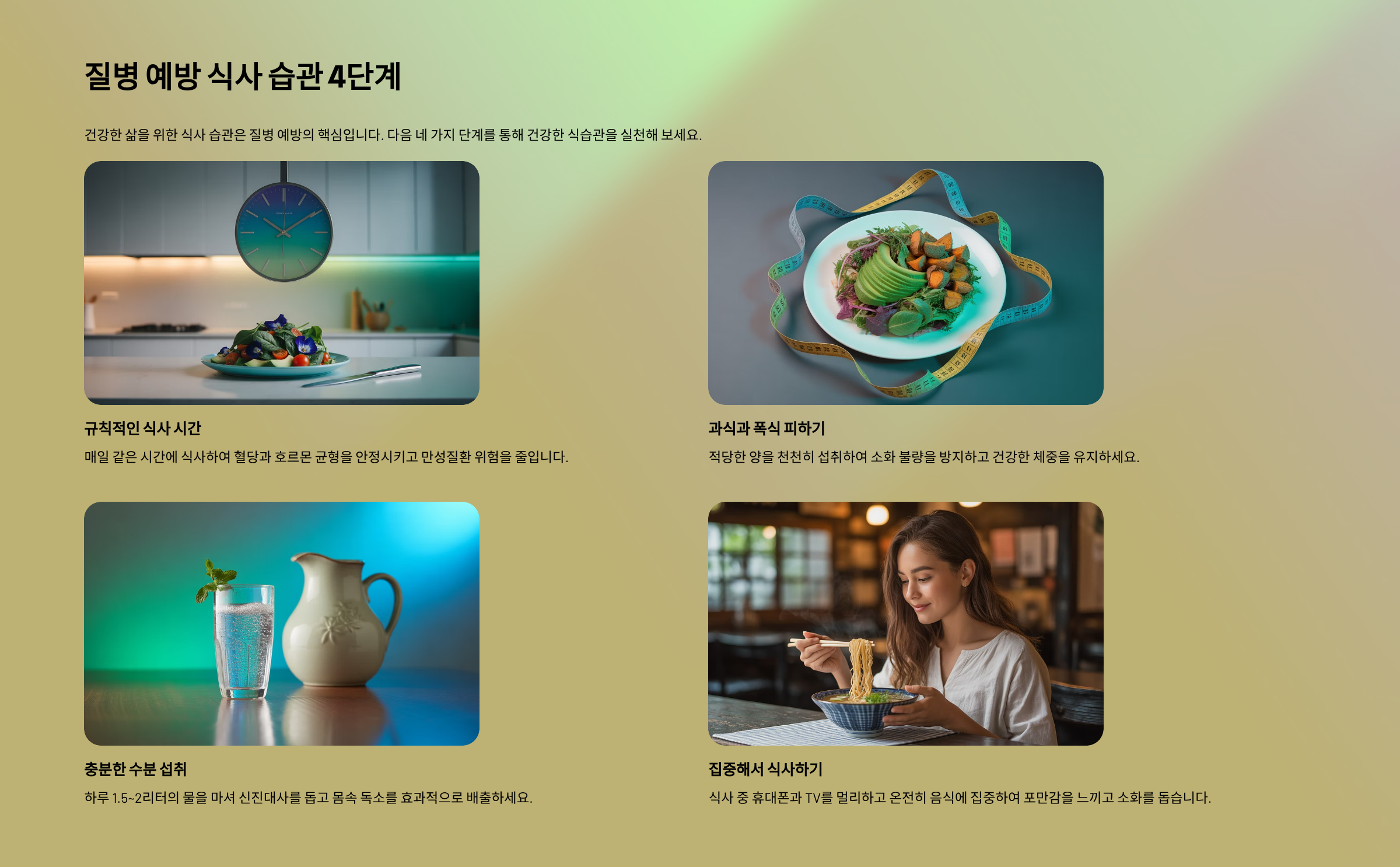 - 규칙적인 식사, 적당한 양, 충분한 수분으로 질병 예방