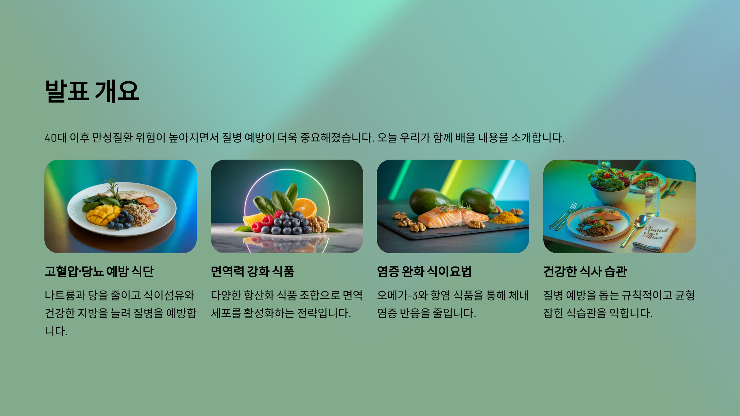 40대 이후 만성질환 위험이 높아지면서 질병 예방이 더욱 중요해졌습니다. 이 글에서는 고혈압과 당뇨를 피하는 식단 원칙, 항산화 식품 조합으로 면역력 높이기, 염증 완화에 좋은 항염 식이요법, 그리고 질병 예방을 돕는 건강한 식사 습관을 단계별로 구체적으로 설명합니다. 지금 바로 실천해 보세요.
