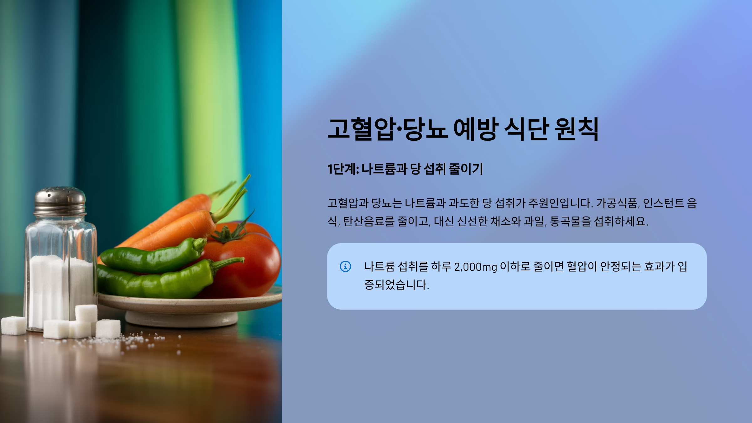고혈압과 당뇨는 나트륨과 과도한 당 섭취가 주원인입니다. 가공식품, 인스턴트 음식, 탄산음료를 줄이고, 대신 신선한 채소와 과일, 통곡물을 섭취하세요. 실제로 나트륨 섭취를 하루 2,000mg 이하로 줄이면 혈압이 안정되는 효과가 입증되었습니다.
