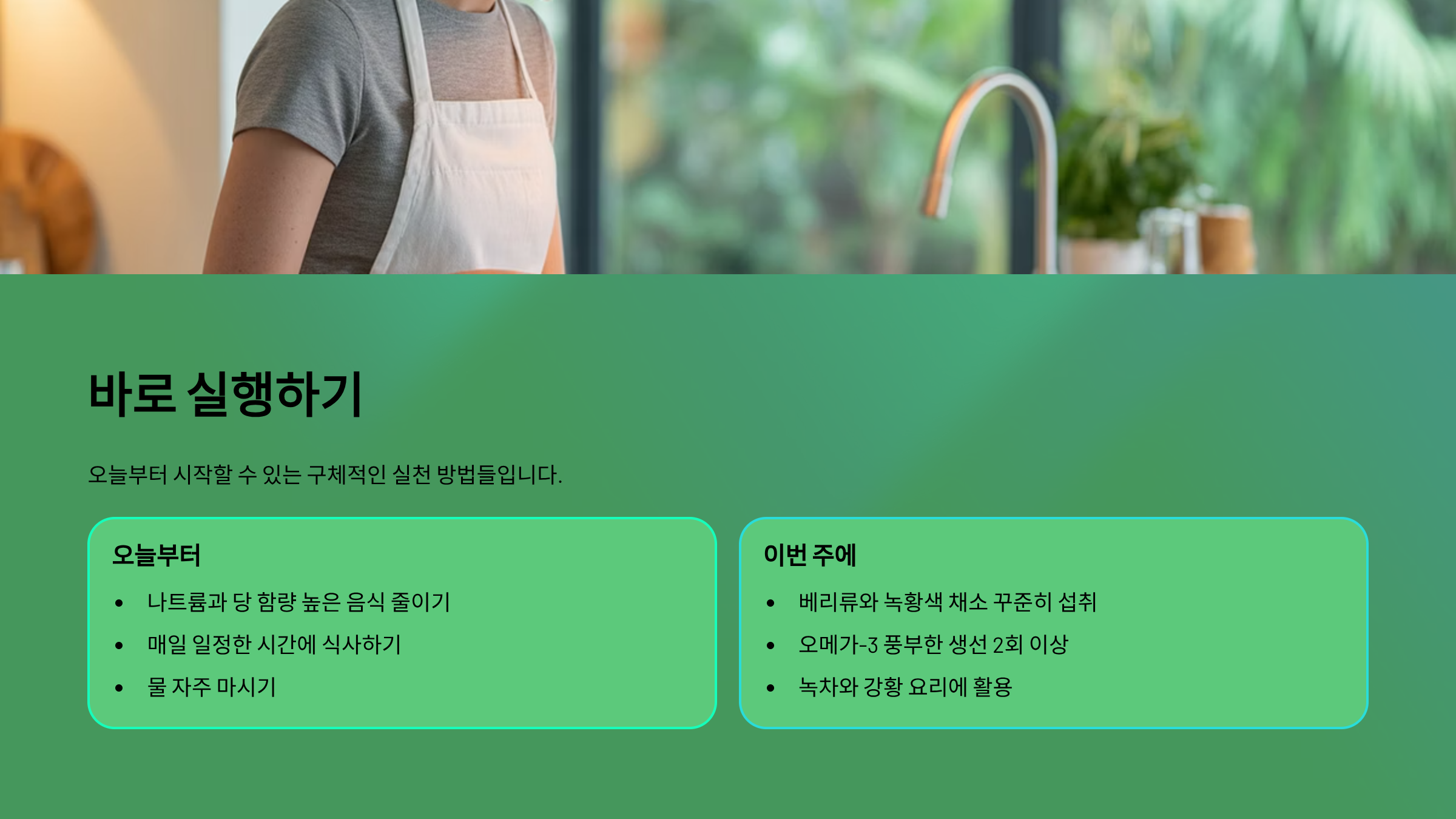 > 체크리스트 > - 오메가-3 풍부한 음식 주 2~3회 섭취 > - 트랜스지방, 가공육 제한하기 > - 항염 채소 및 향신료 꾸준히 먹기