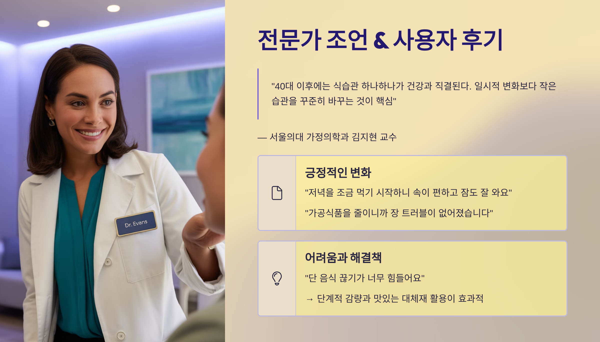 서울의대 가정의학과 김지현 교수는 “40대 이후에는 식습관 하나하나가 건강과 직결된다. 일시적 변화보다 작은 습관을 꾸준히 바꾸는 것이 핵심”이라 강조합니다.