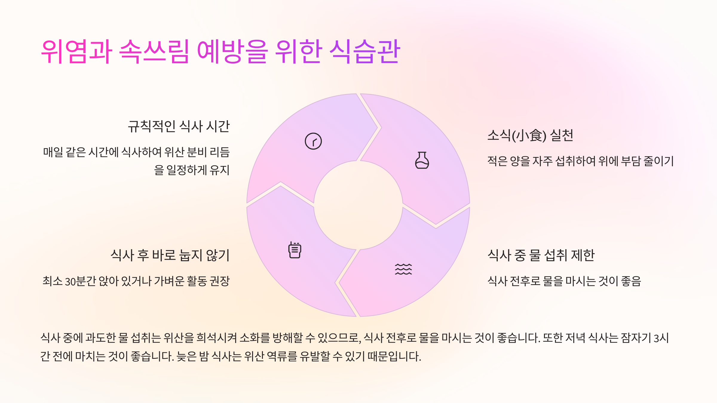매일 같은 시간에 식사하여 위산 분비 리듬을 일정하게 유지하면 위 건강에 도움이 됩니다.