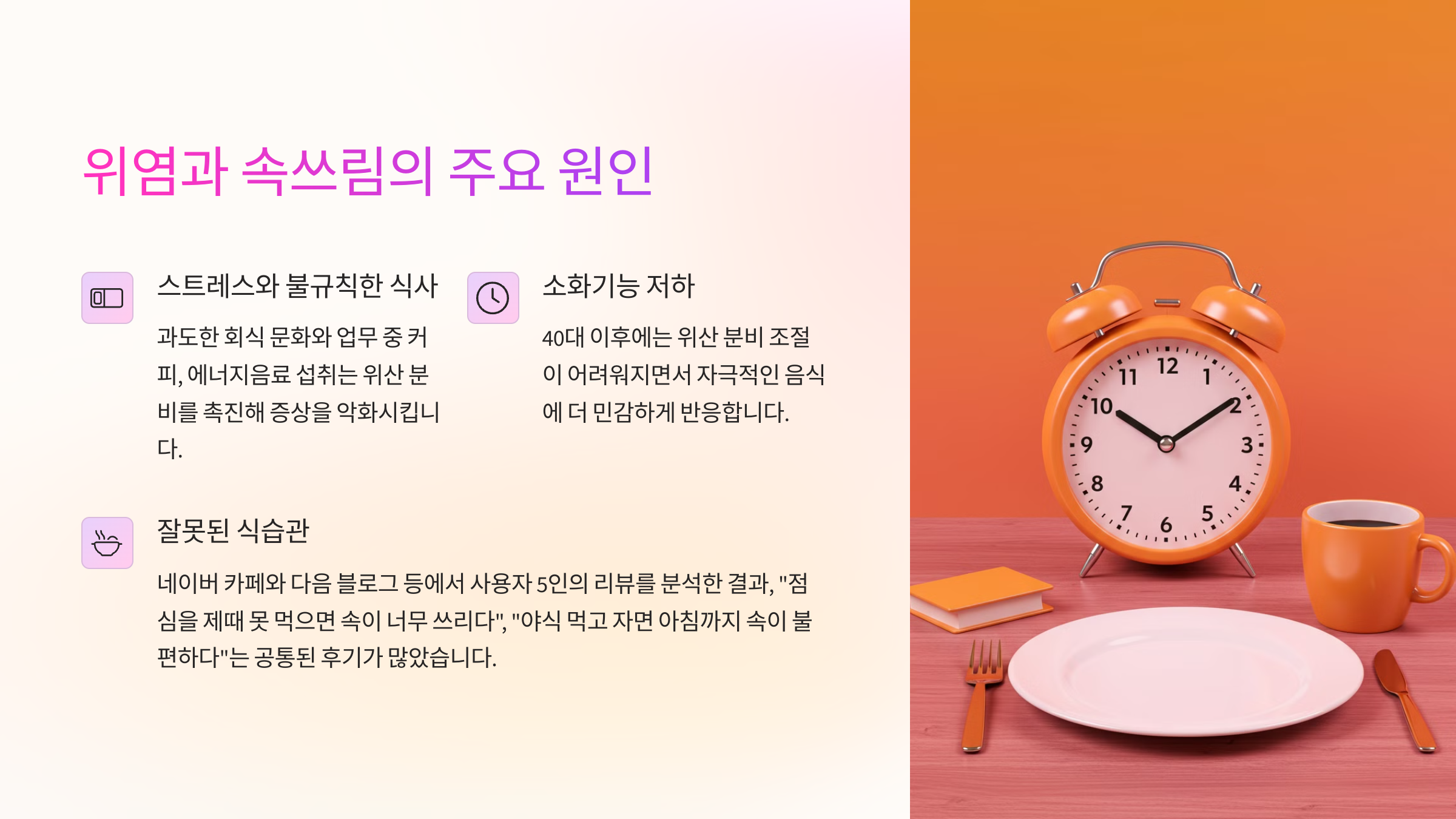 네이버 카페와 다음 블로그 등에서 사용자 5인의 리뷰를 분석한 결과, “점심을 제때 못 먹으면 속이 너무 쓰리다”, “야식 먹고 자면 아침까지 속이 불편하다”는 공통된 후기가 많았습니다. 이는 시간에 쫓겨 식사를 불규칙하게 하는 직장인들에게 특히 위염이 흔하다는 방증입니다.