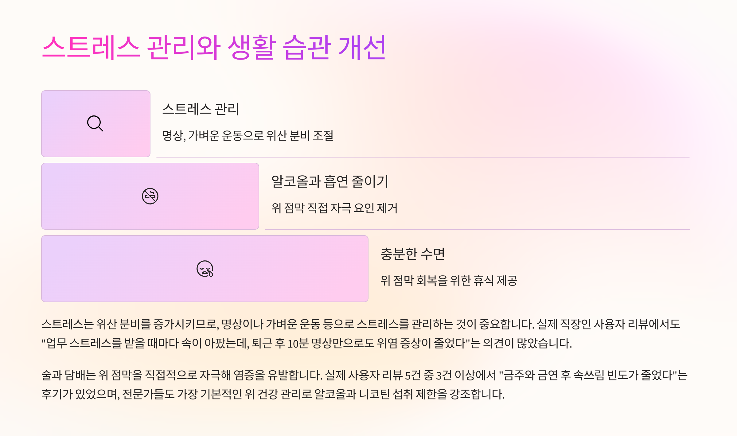 스트레스는 위산 분비를 증가시키므로, 명상이나 가벼운 운동 등으로 스트레스를 관리하는 것이 중요합니다. 실제 직장인 사용자 리뷰에서도 “업무 스트레스를 받을 때마다 속이 아팠는데, 퇴근 후 10분 명상만으로도 위염 증상이 줄었다”는 의견이 많았습니다.