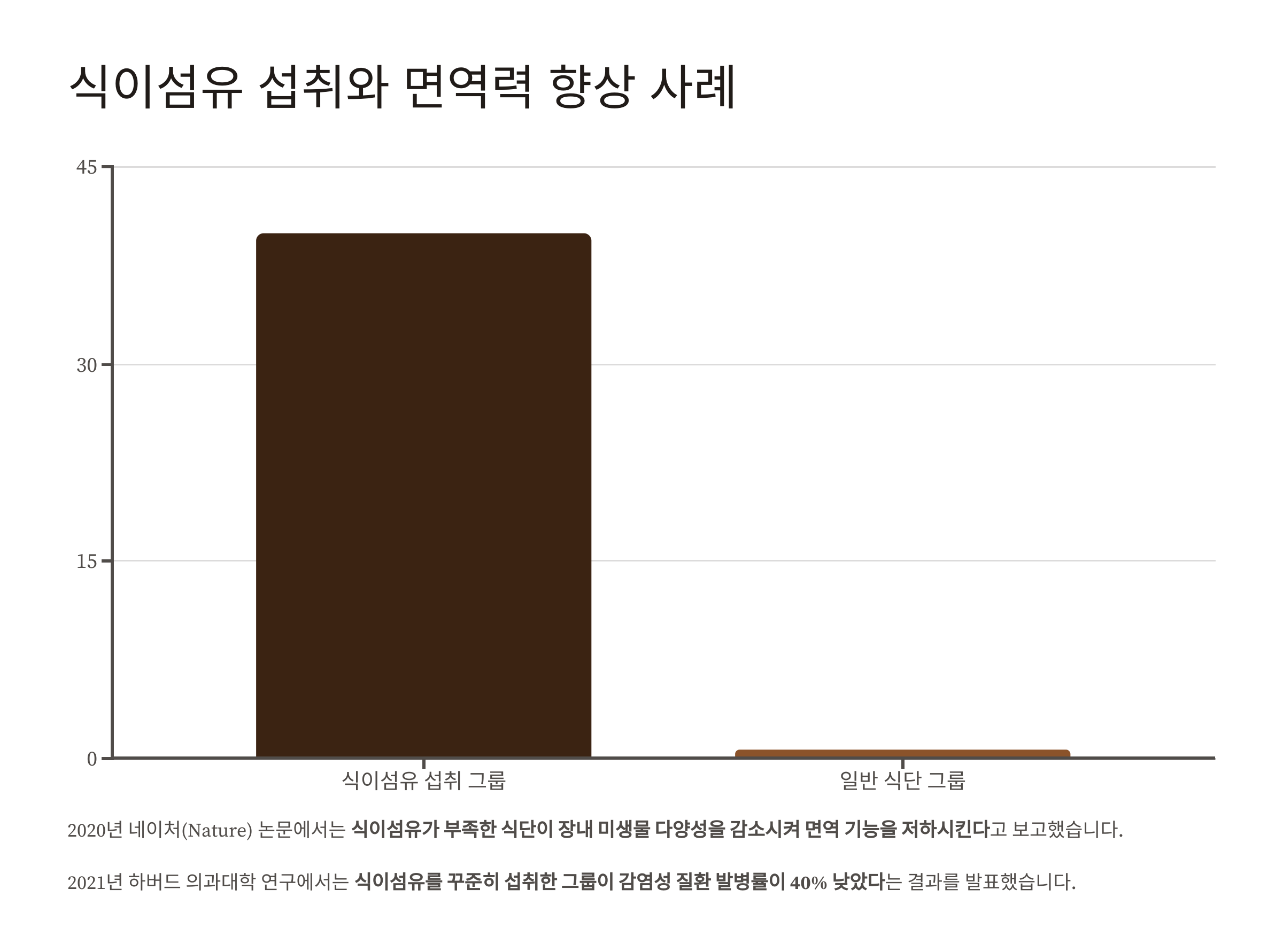 • 2021년 하버드 의과대학 연구에서는 식이섬유를 꾸준히 섭취한 그룹이 감염성 질환 발병률이 40% 낮았다는 결과 발표.