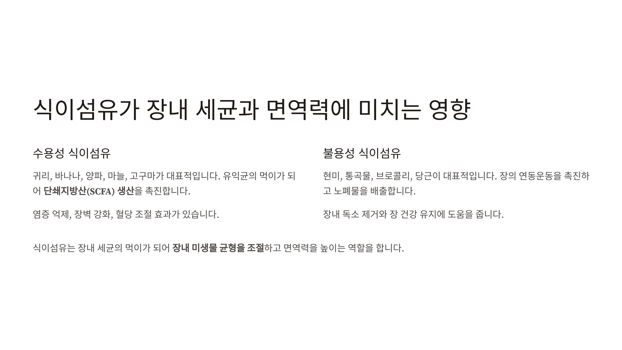 • 2020년 네이처(Nature) 논문에서는 식이섬유가 부족한 식단이 장내 미생물 다양성을 감소시켜 면역 기능을 저하시킨다고 보고함.