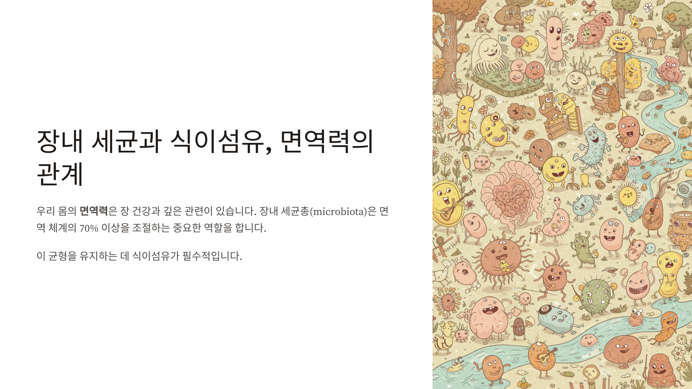 우리 몸의 면역력은 장 건강과 깊은 관련이 있습니다. 장 내 세균총(microbiota)은 면역 체계의 70% 이상을 조절하는 중요한 역할을 하며, 이 균형을 유지하는 데 식이섬유가 필수적입니다.