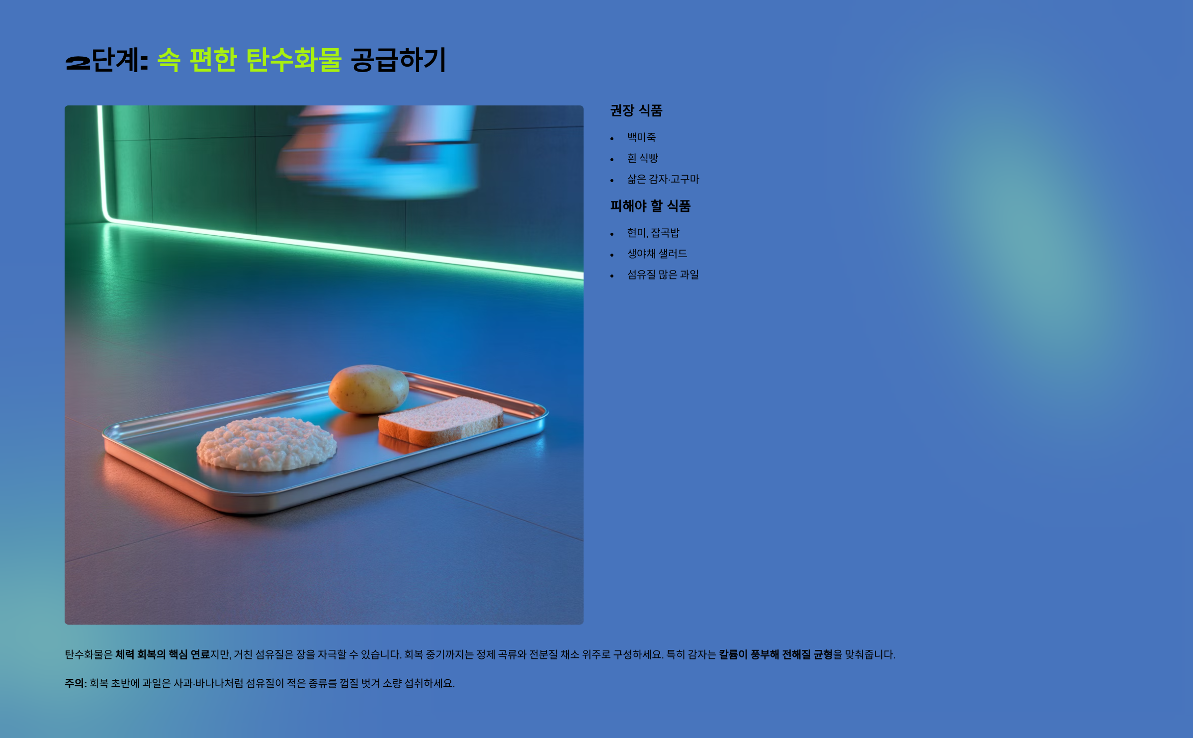 1. 회복 초기에는 부드러운 단백질과 속 편한 탄수화물로 시작