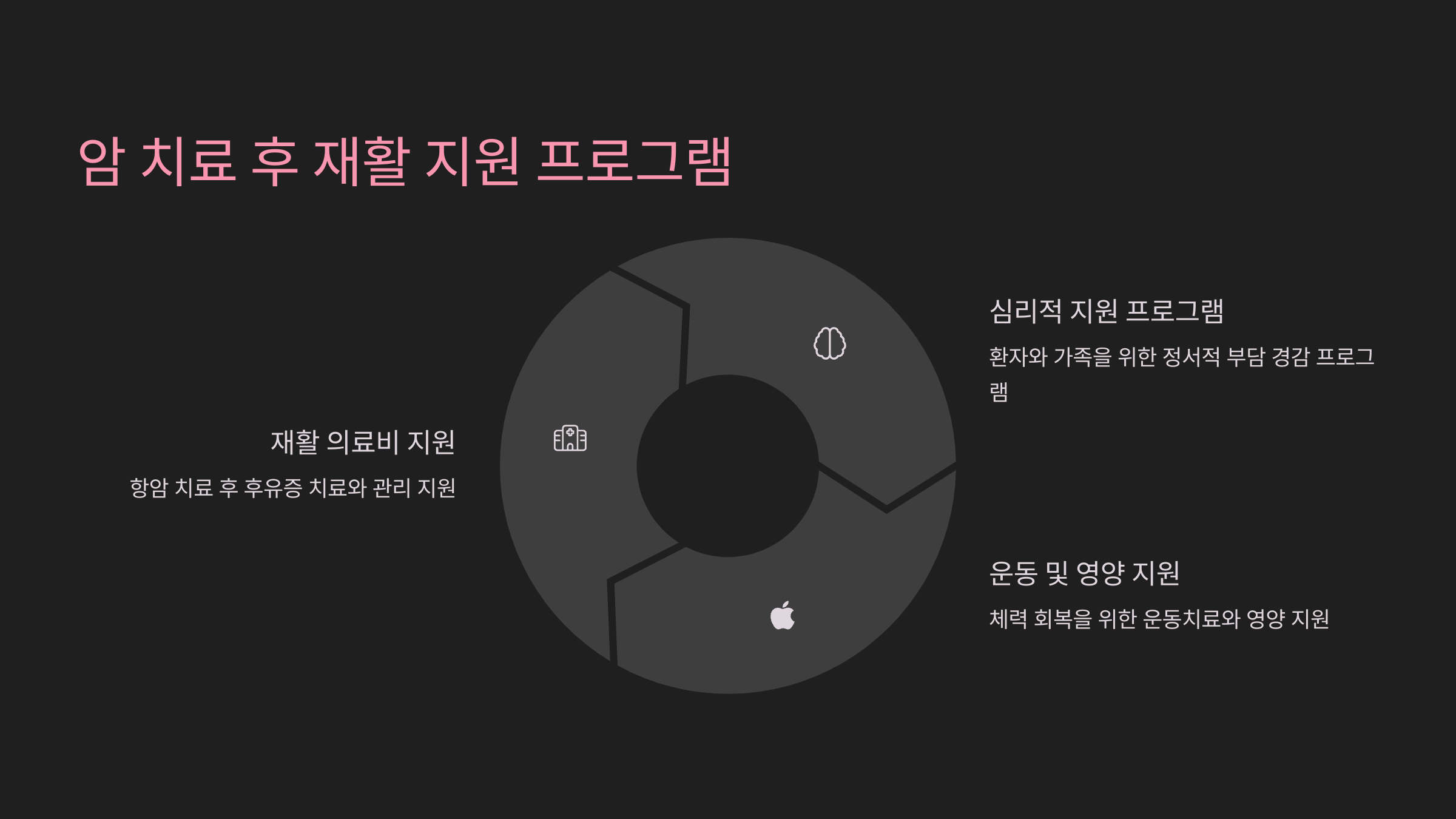 - 재활 의료비 지원: 암 치료 후 재활치료비를 지원하는 프로그램이 있습니다. 항암 치료 후 발생할 수 있는 후유증에 대한 치료와 관리가 포함됩니다.